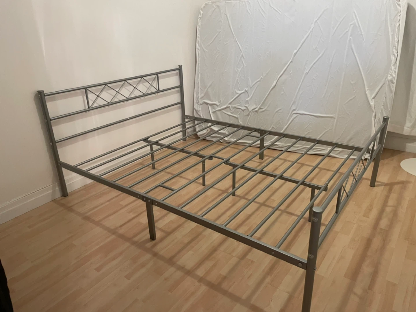 Queen bed frame in silver to suit any decor (the pics with it in black are from online- they don’t sell silver any more). Good looking and sturdy with metal slats. Easy assembly.