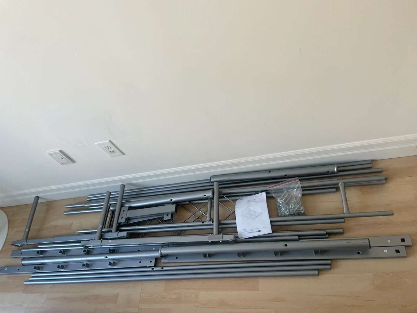Has been disassembled and has all parts and instructions. The pieces are all labelled for quick assembly.