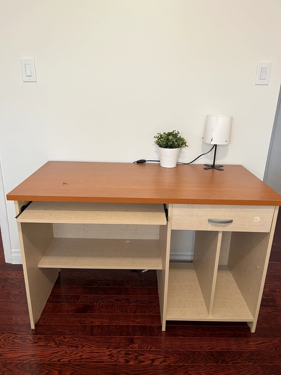 Selling a wooden computer desk in good condition. It features a slide-out keyboard tray and storage shelves on the side. Perfect for a home office or study space!