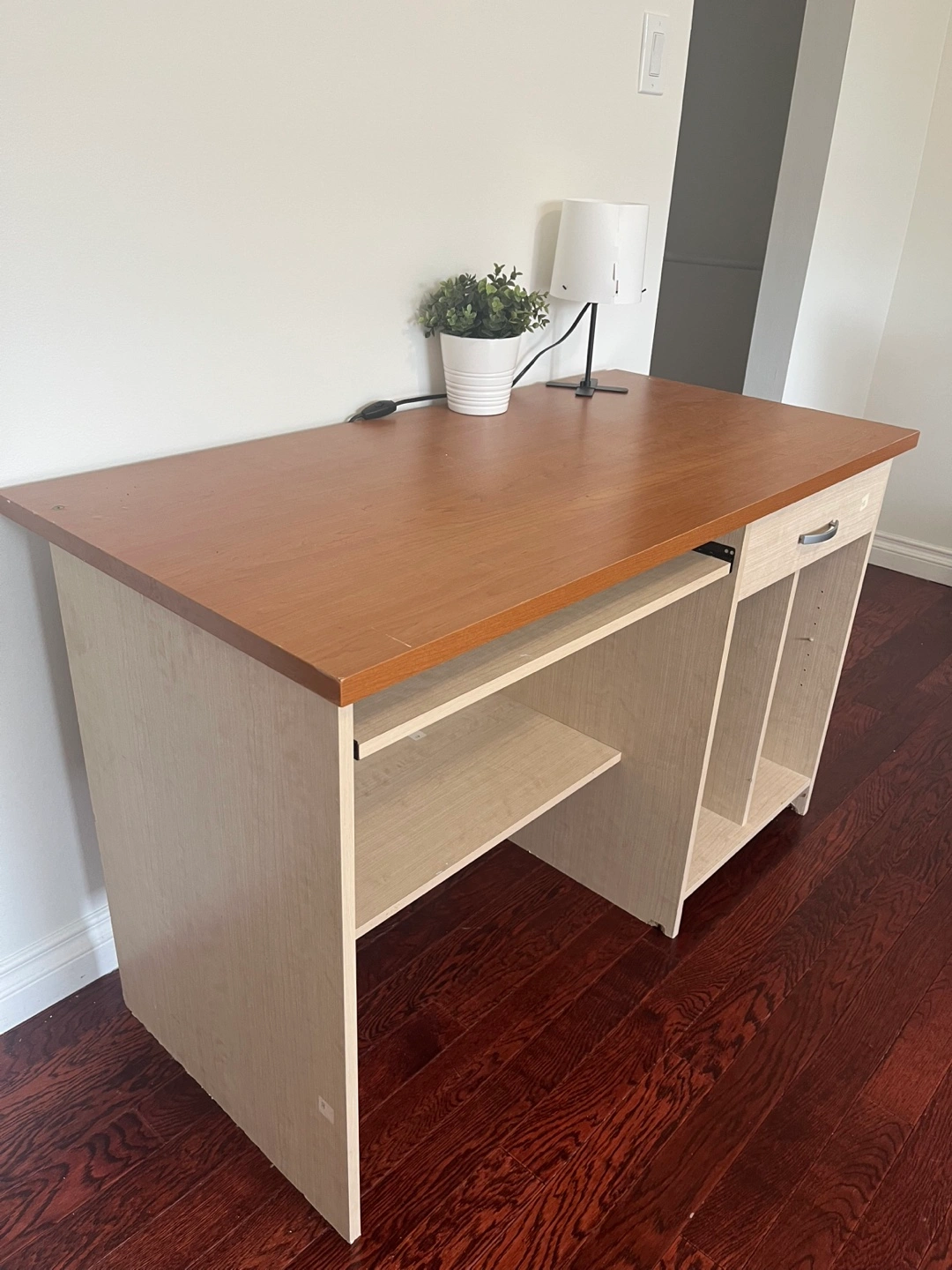 Selling a wooden computer desk in good condition. It features a slide-out keyboard tray and storage shelves on the side. Perfect for a home office or study space!