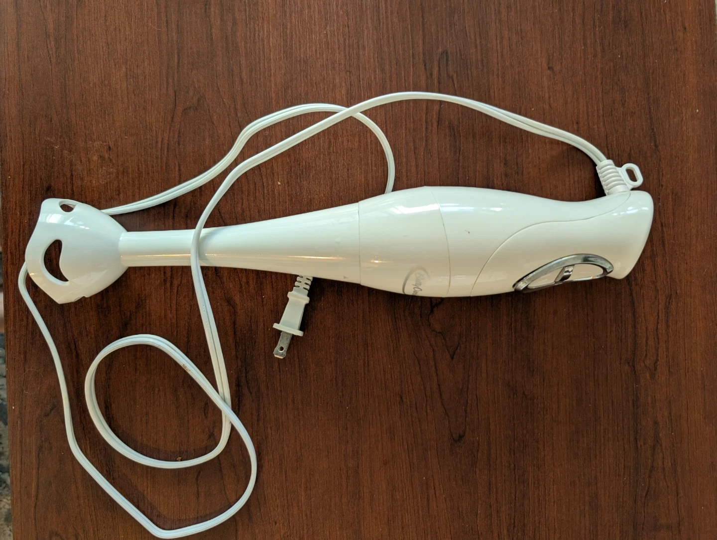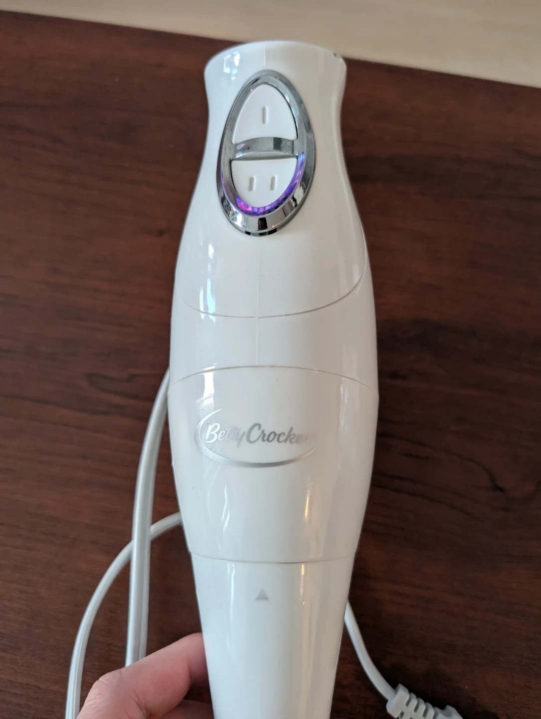 Selling a Betty Crocker immersion hand blender! It's in great condition and perfect for making smoothies, soups, and sauces. The blender is white and easy to use with a simple two-button control. A great addition to any kitchen!