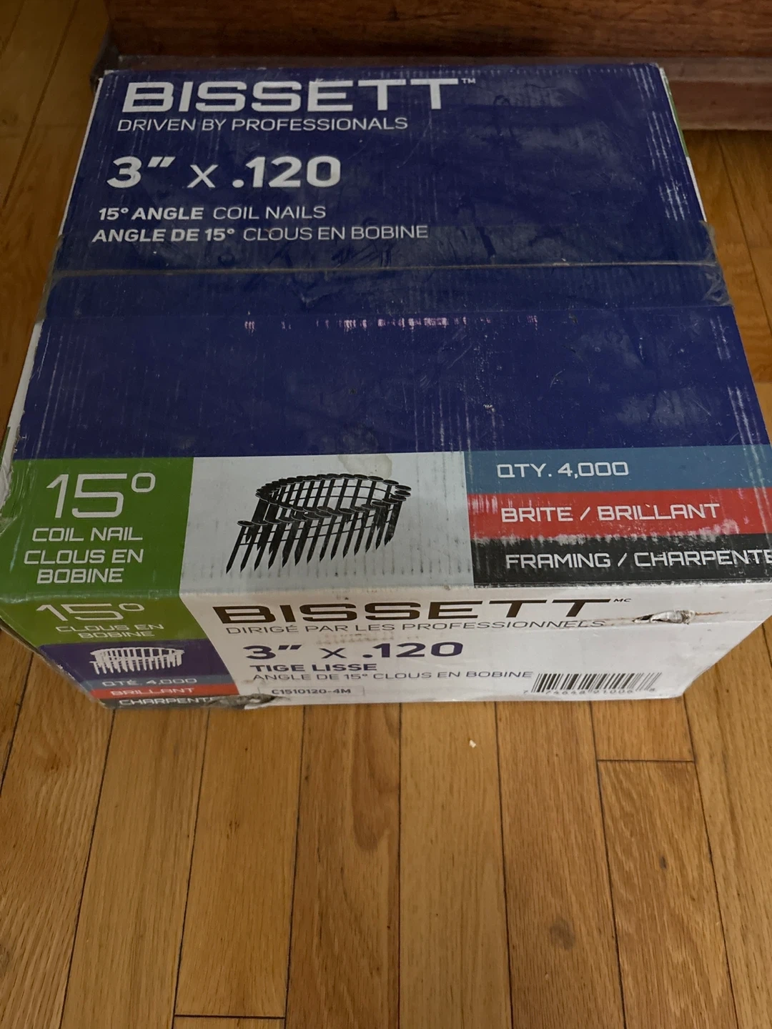Bissett 15° angle coil nails for framing and carpentry. This box contains 4,000 nails. The size is 3" x .120.