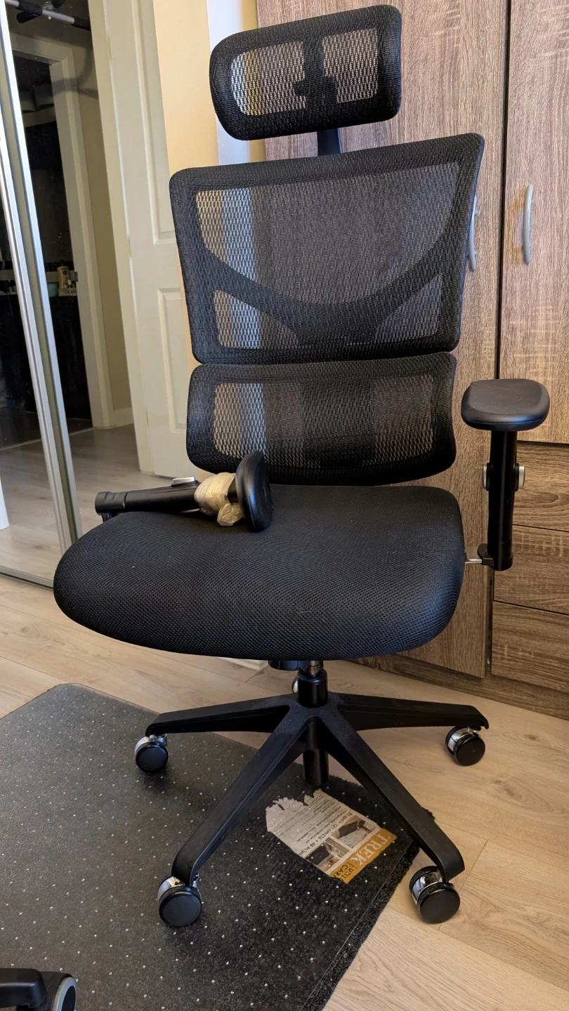 This is a black mesh office chair with adjustable headrest and armrests. It features a comfortable padded seat and a sturdy base with wheels for easy mobility. The breathable mesh back provides good ventilation. Great for long hours of work or study!