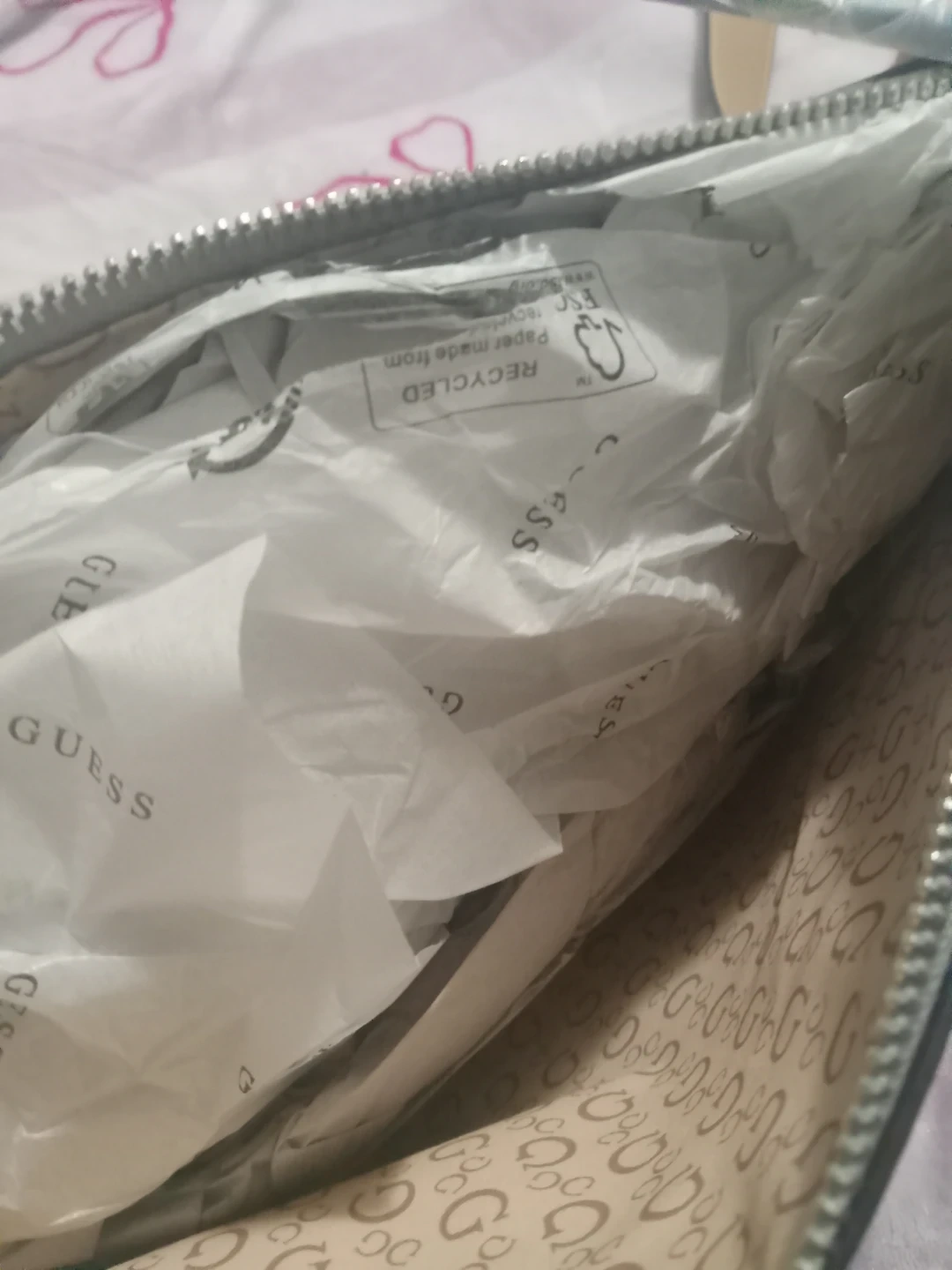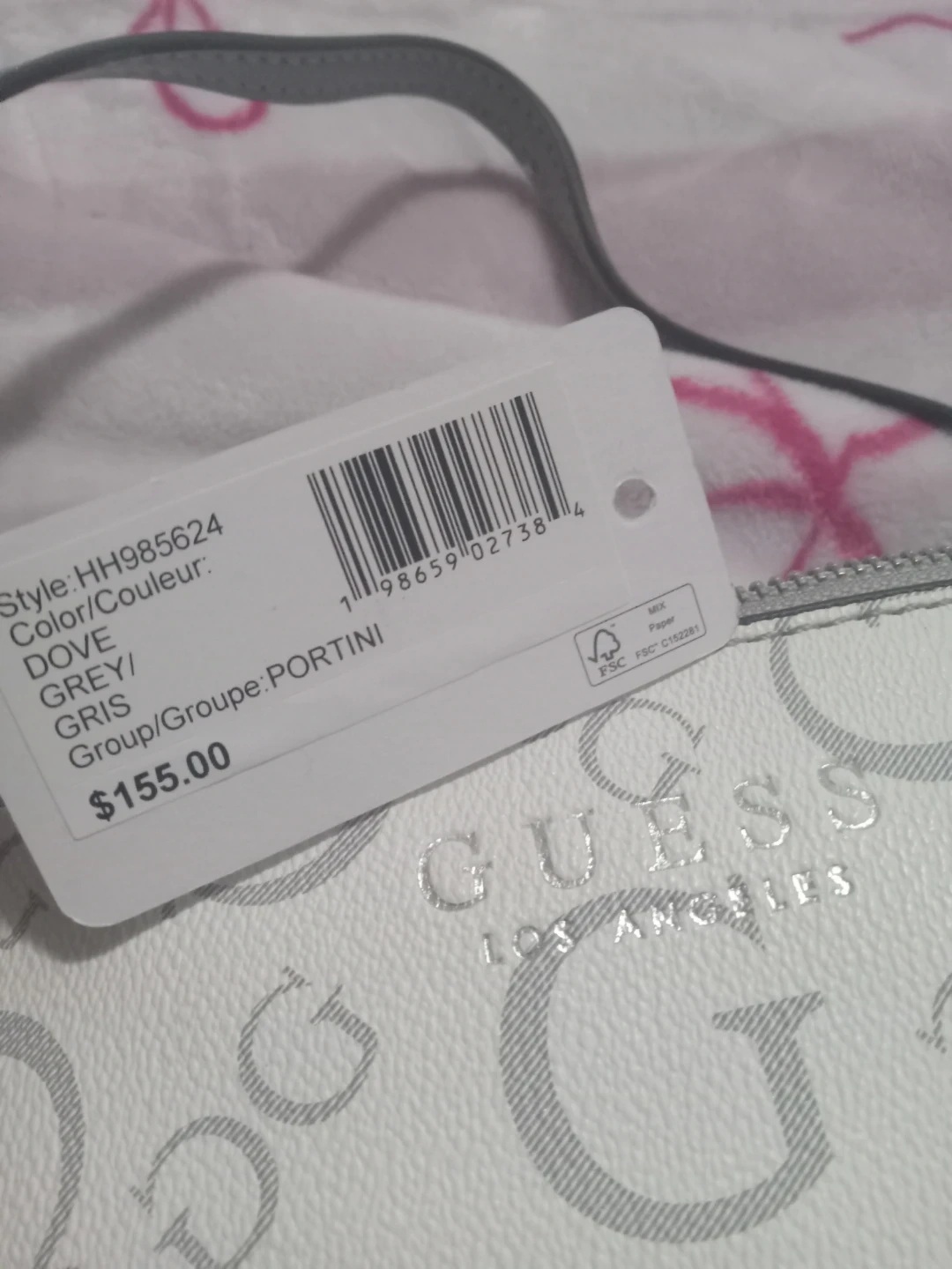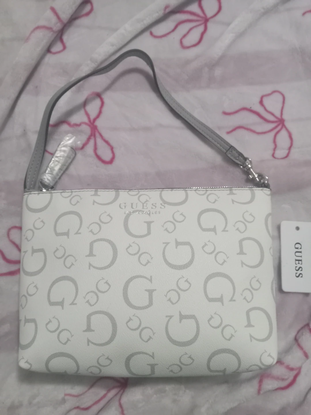 This is a Guess Portini handbag in the Dove Grey colour. It features the iconic Guess "G" pattern all over. This stylish accessory comes with a single grey strap. Never worn before and it's brand new
