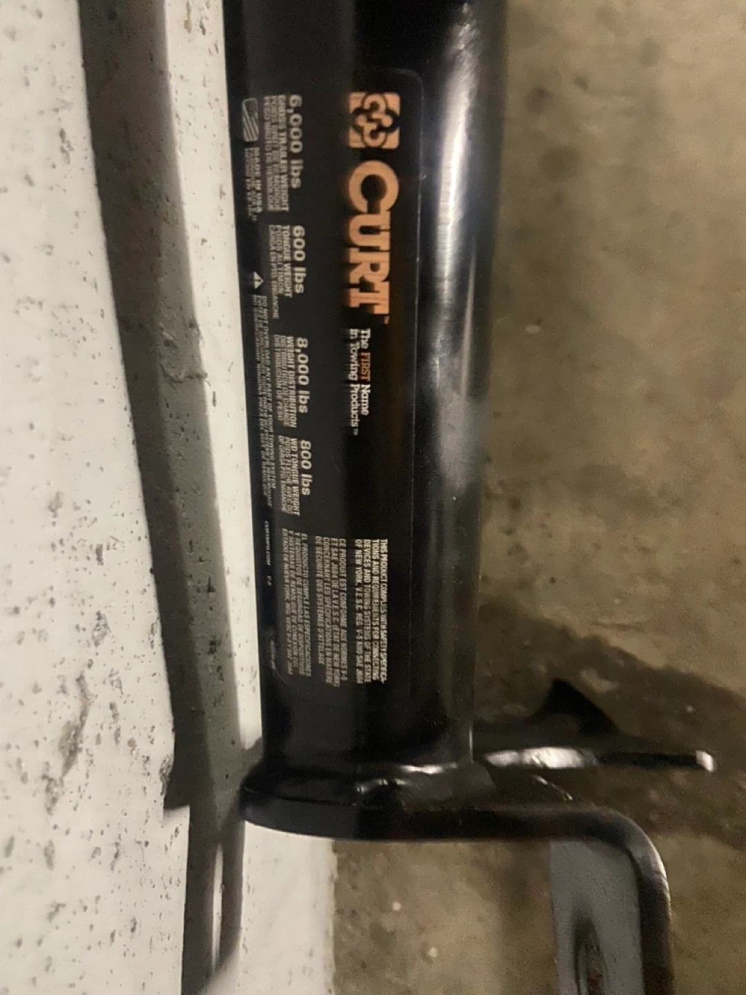 CURT hitch receiver, likely for a vehicle. Rated for 6,000 lbs towing weight and 600 lbs tongue weight, or 8,000 lbs towing and 800 lbs tongue weight depending on application. It's made of durable black metal. This is a common accessory for transporting trailers or other gear.