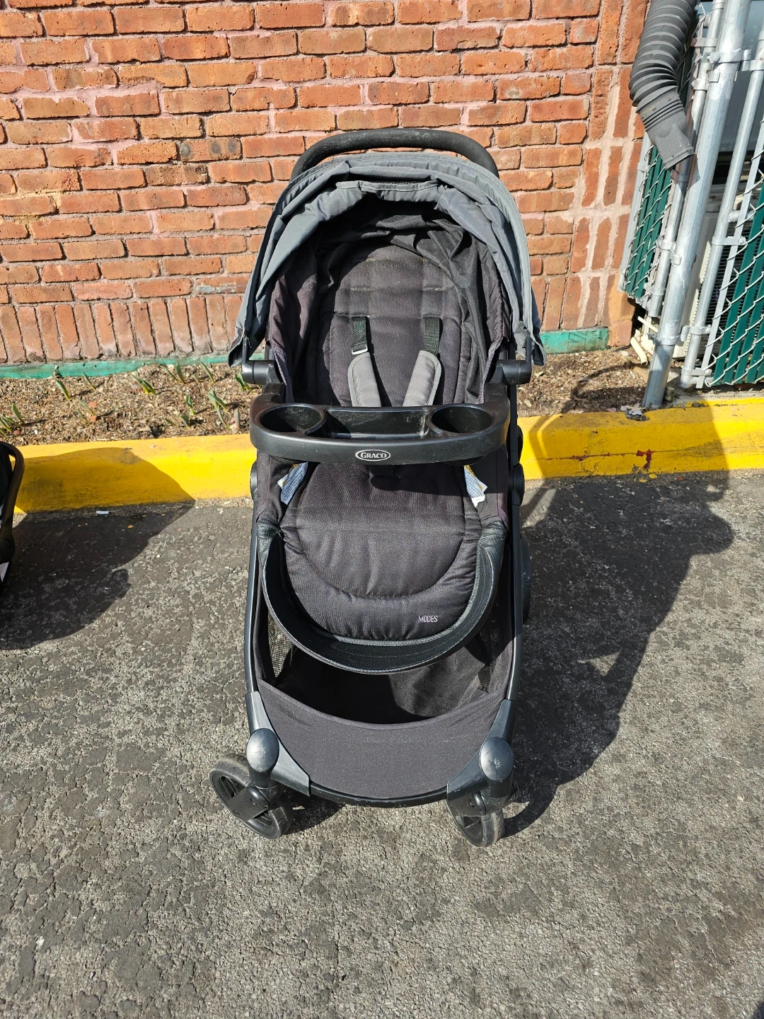 This Graco Modes travel system includes a stroller and infant car seat. The stroller features a reversible seat and canopy. The car seat attaches easily to the stroller frame.