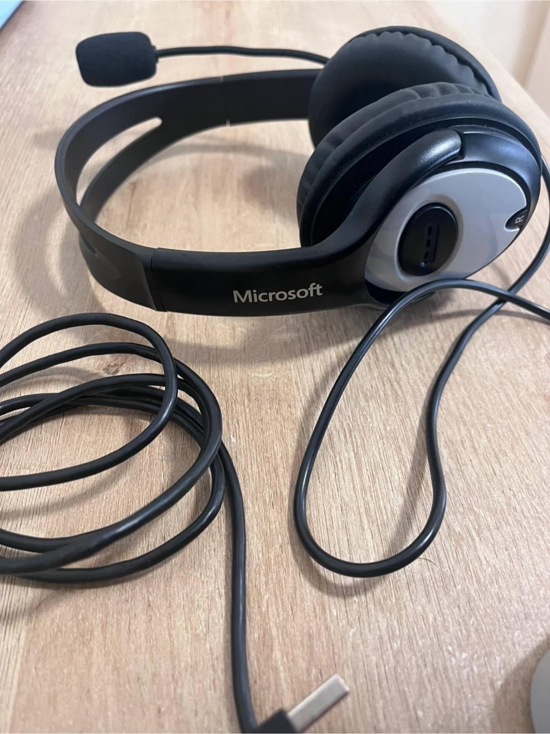Microsoft stereo headset with a built-in microphone. Features an inline control pod for volume adjustment and mic muting. USB connection.