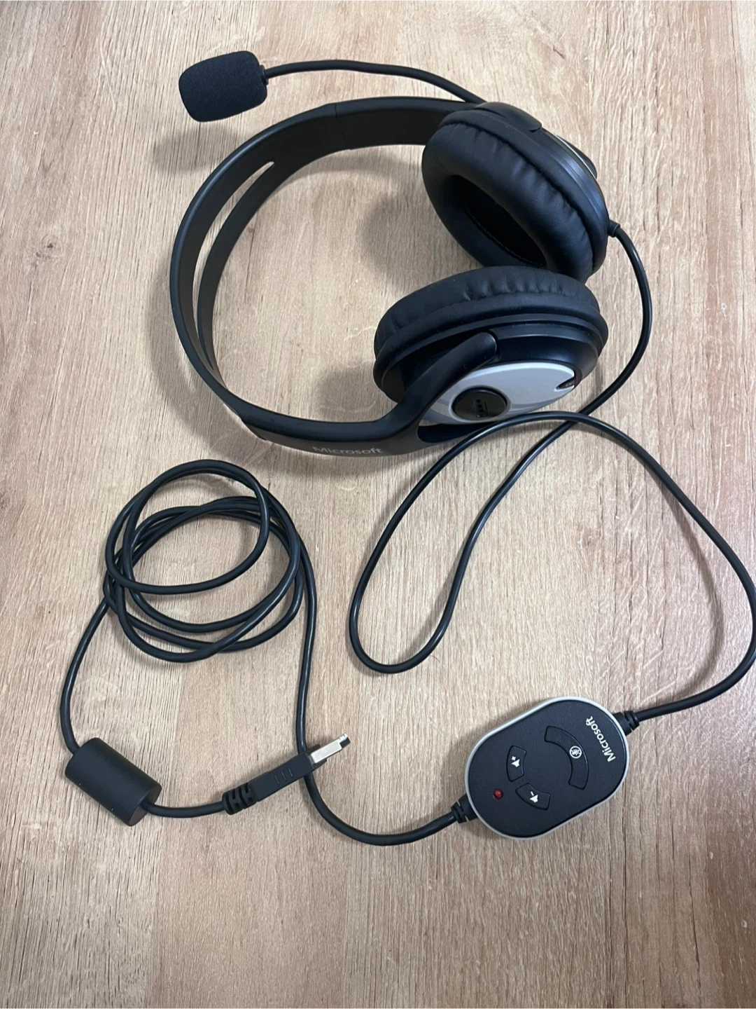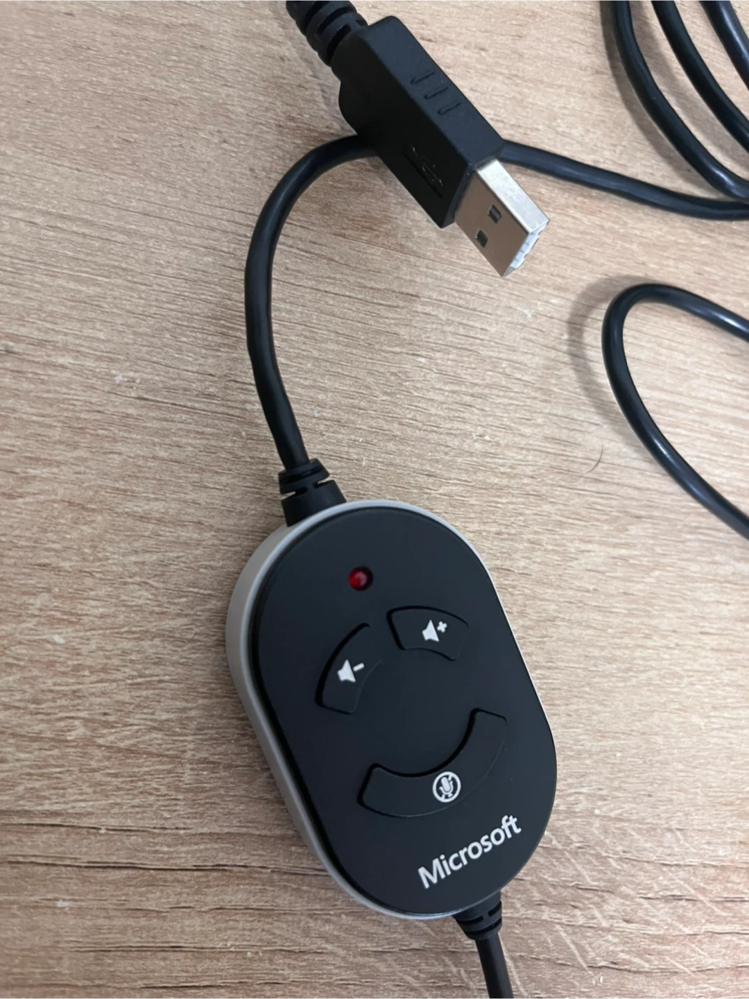Microsoft stereo headset with a built-in microphone. Features an inline control pod for volume adjustment and mic muting. USB connection.