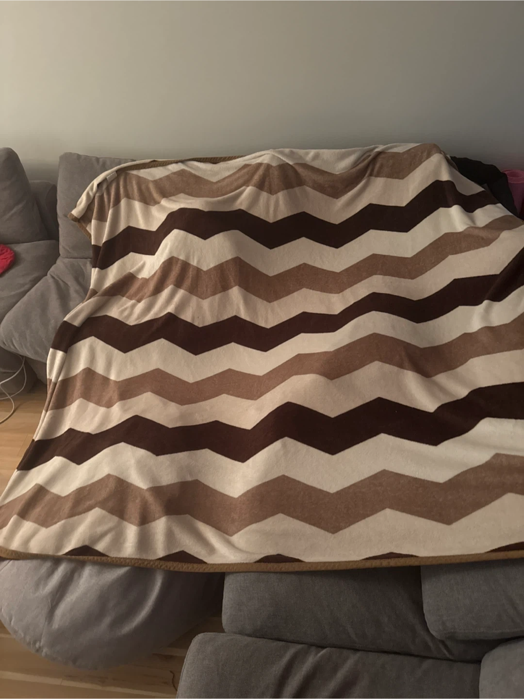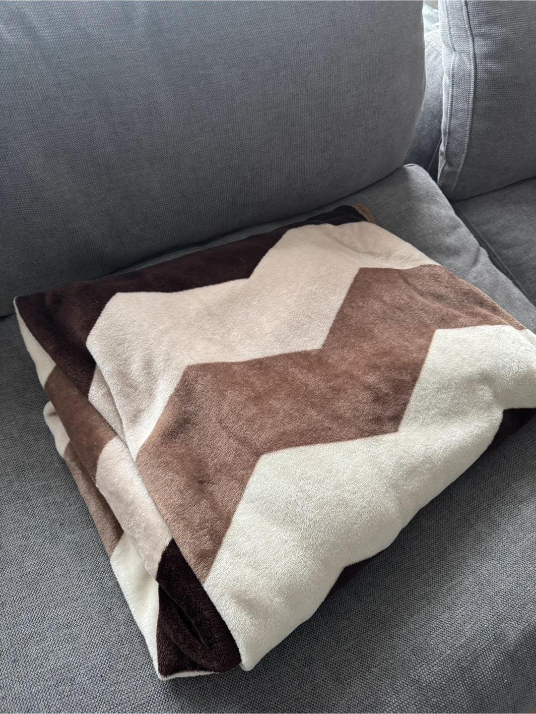 Cozy fleece throw blanket with a brown, white, and tan chevron pattern. It's soft and perfect for snuggling up on the couch. Great for adding a touch of warmth and style to any room!