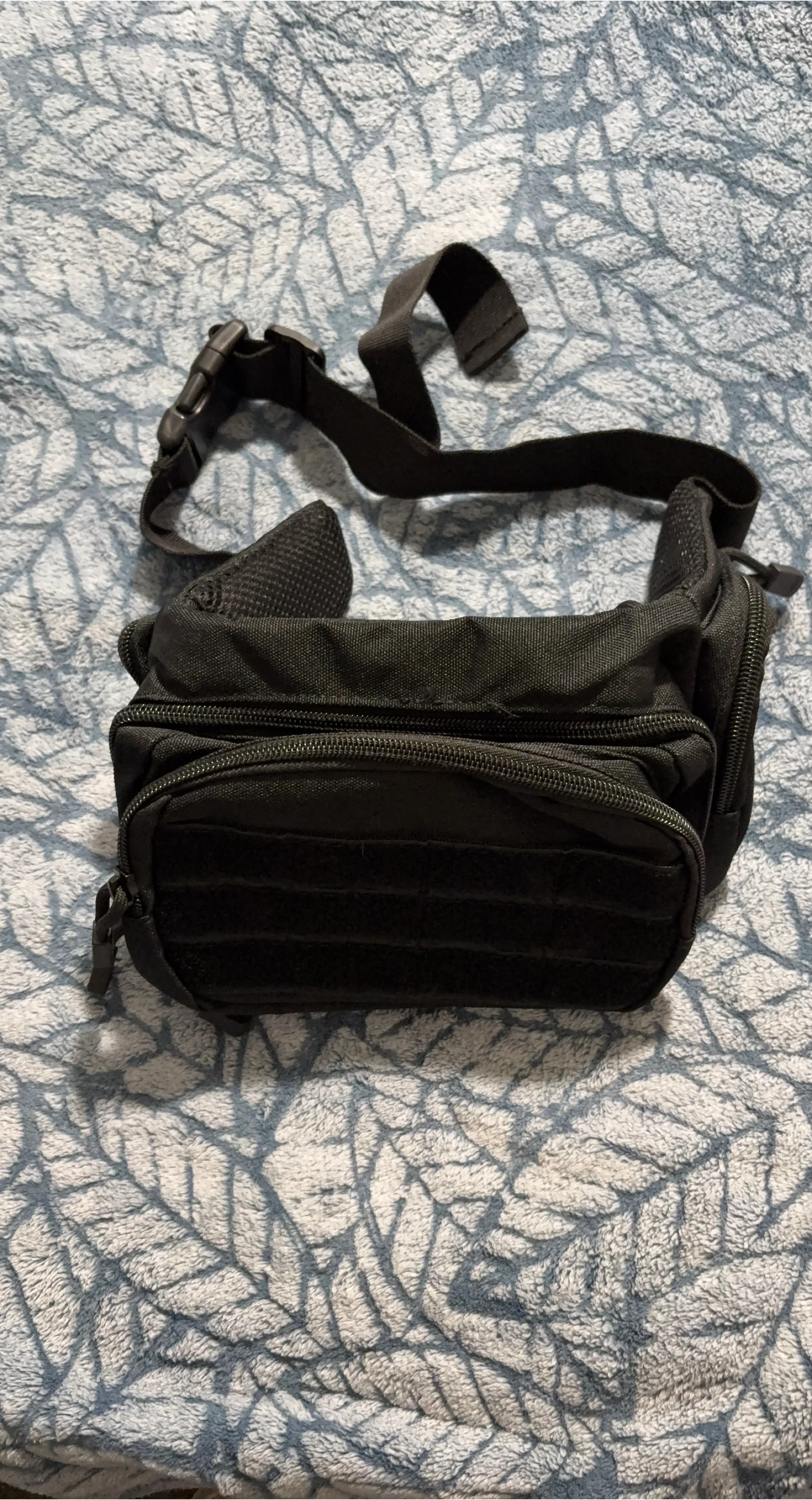 Black tactical fanny pack with multiple zippered compartments. Features MOLLE webbing on the front for customization. Adjustable strap with a quick-release buckle.