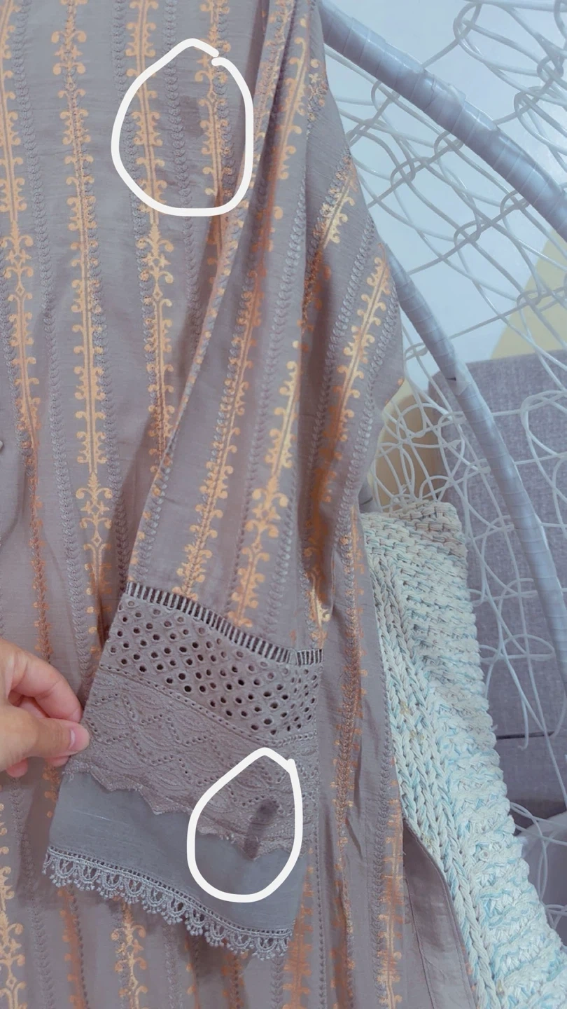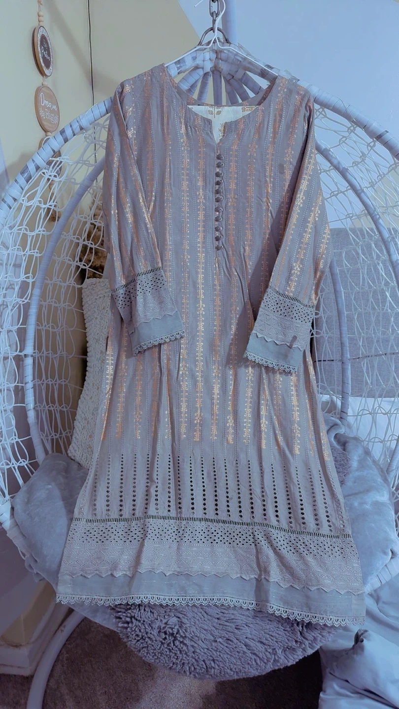 Grey kurti featuring a delicate gold vertical stripe pattern and intricate lace detailing on the sleeves and hem. It has a V-neckline with button accents. Material appears to be a lightweight fabric suitable for casual wear.