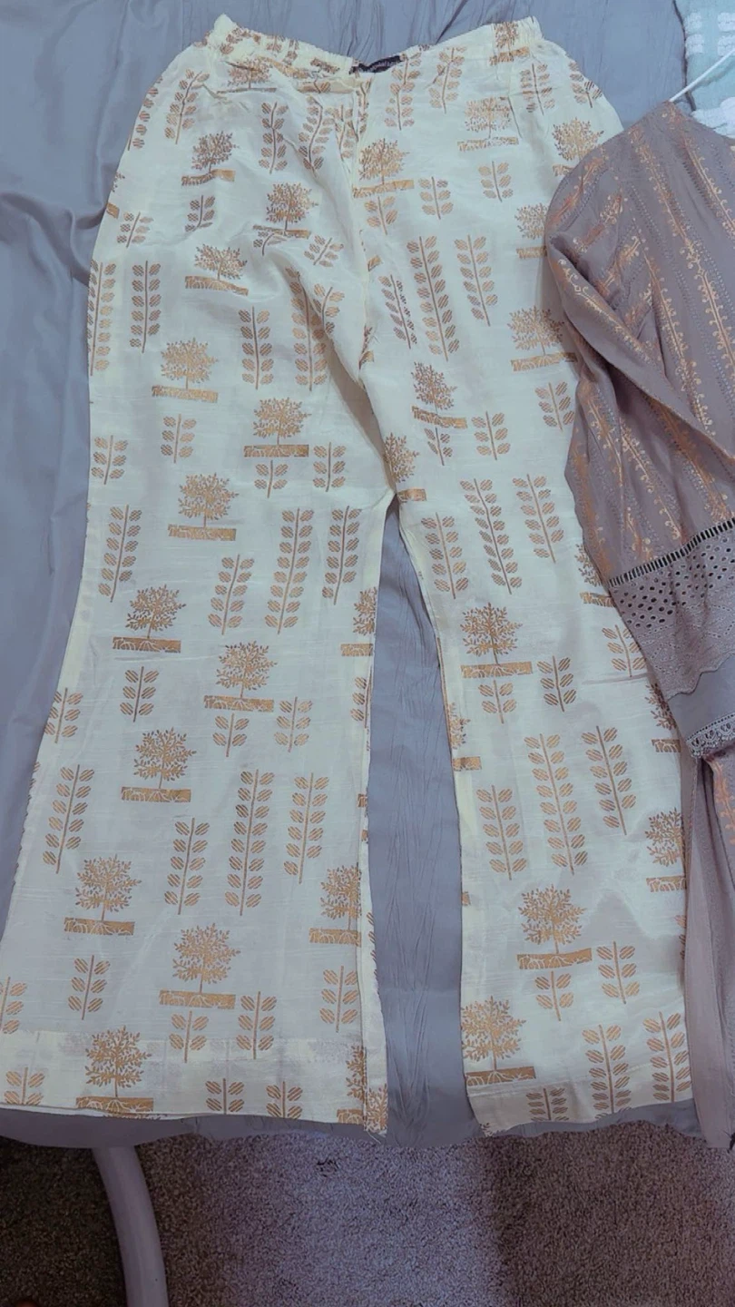 Grey kurti featuring a delicate gold vertical stripe pattern and intricate lace detailing on the sleeves and hem. It has a V-neckline with button accents. Material appears to be a lightweight fabric suitable for casual wear.