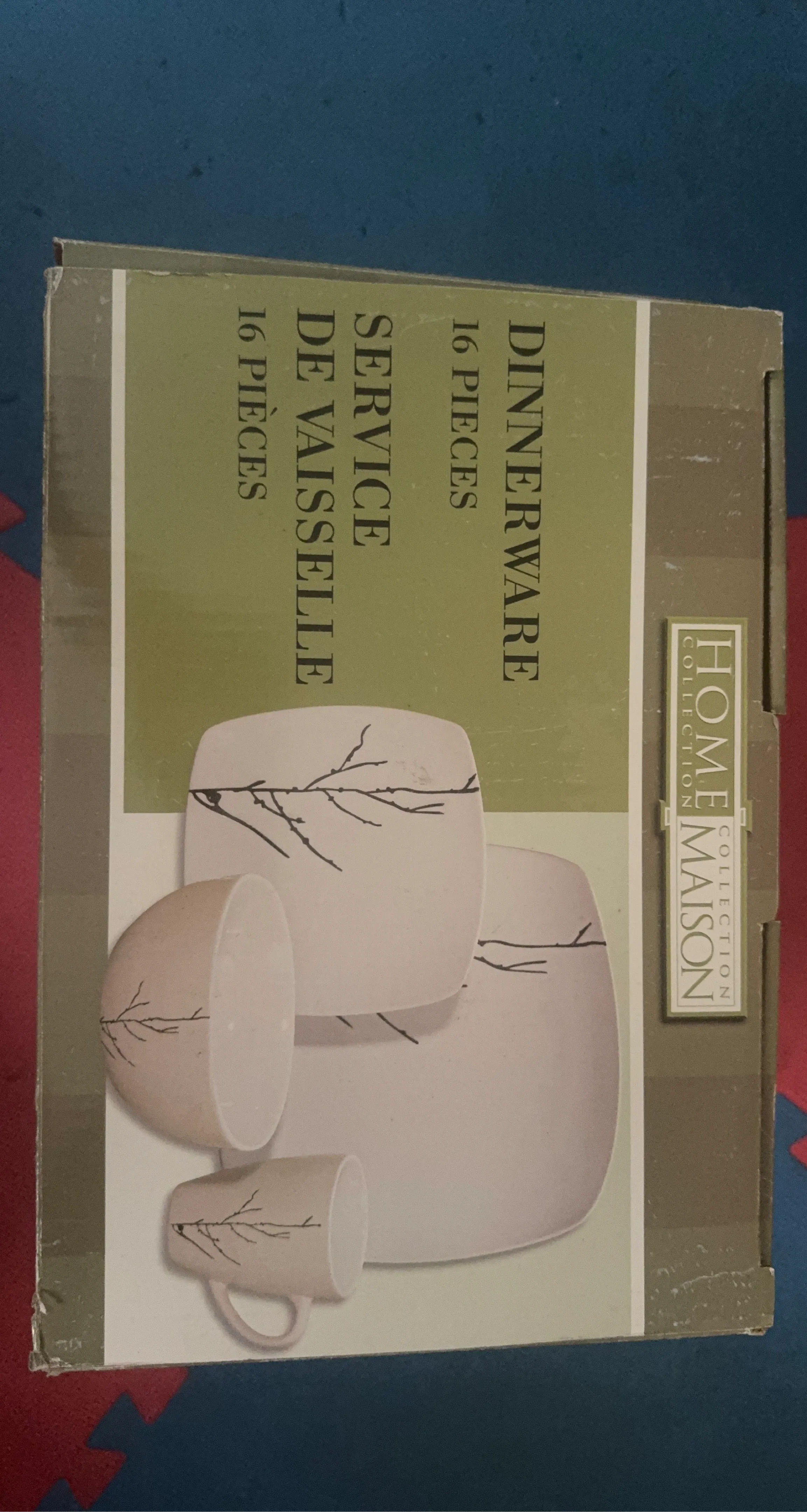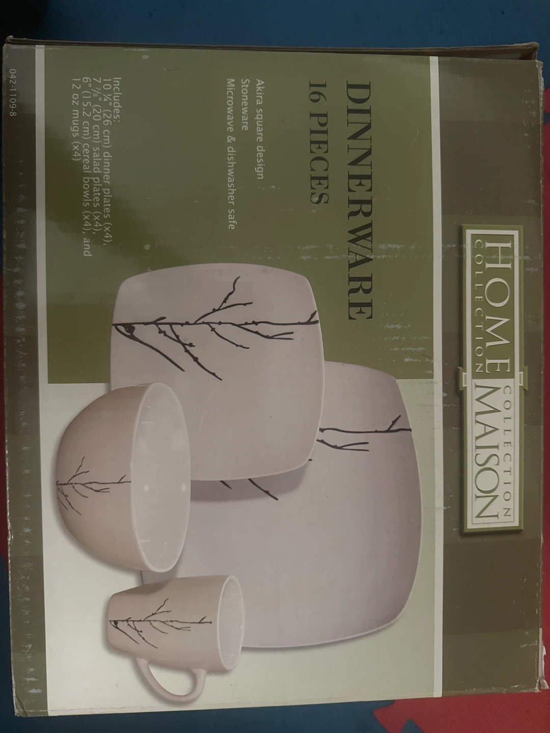 Home Maison 16-piece dinnerware set. Akura square design stoneware. Includes four 10.25-inch dinner plates, four 7.75-inch salad plates, four 6-inch cereal bowls, and four 12 oz mugs. Microwave and dishwasher safe.