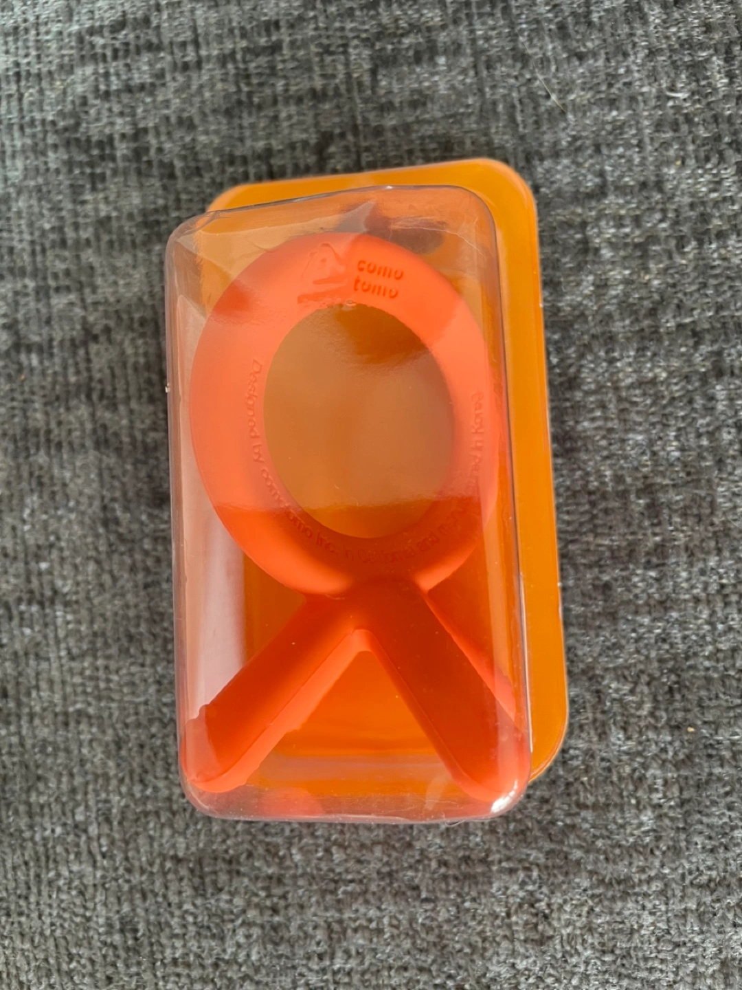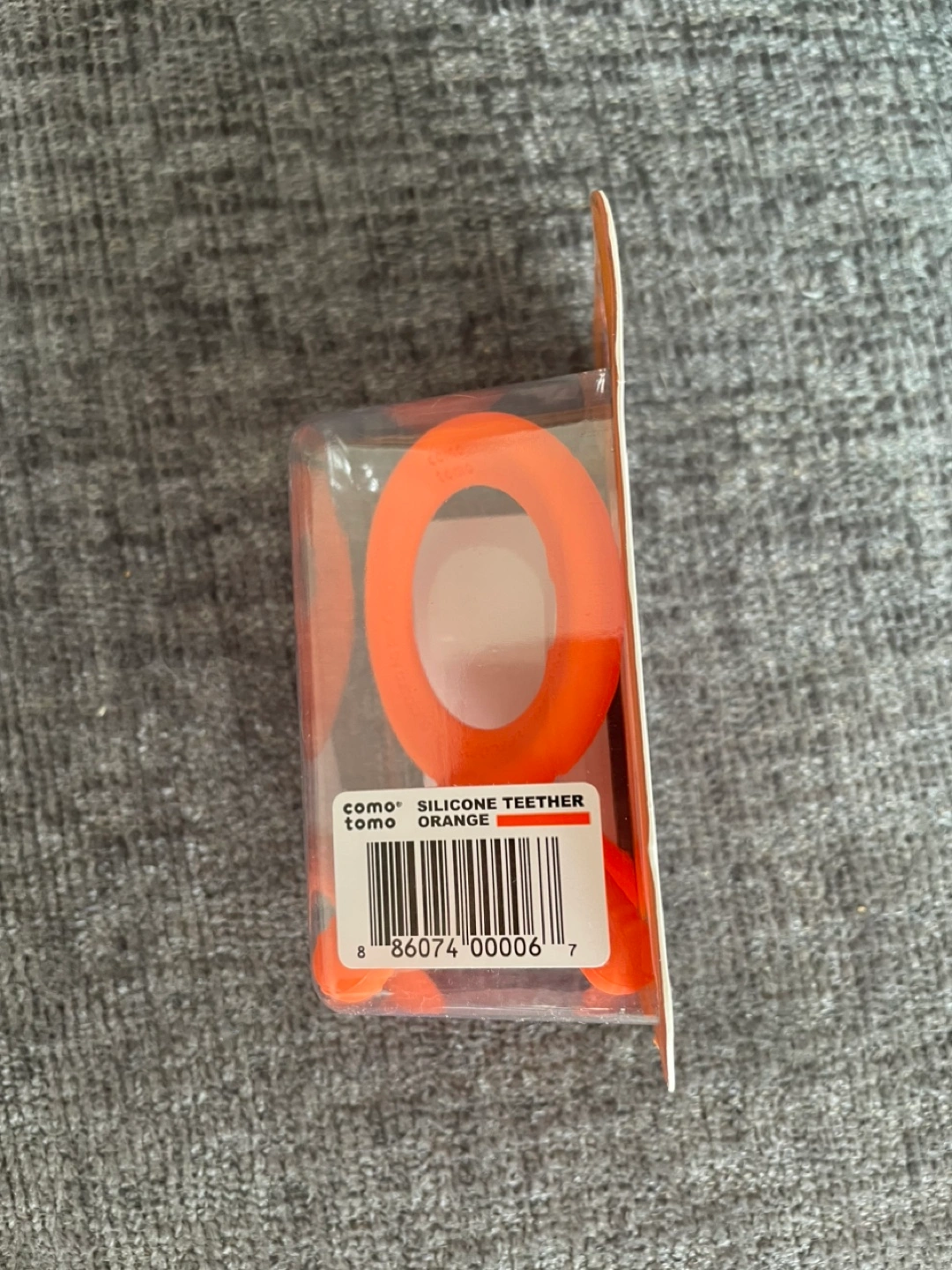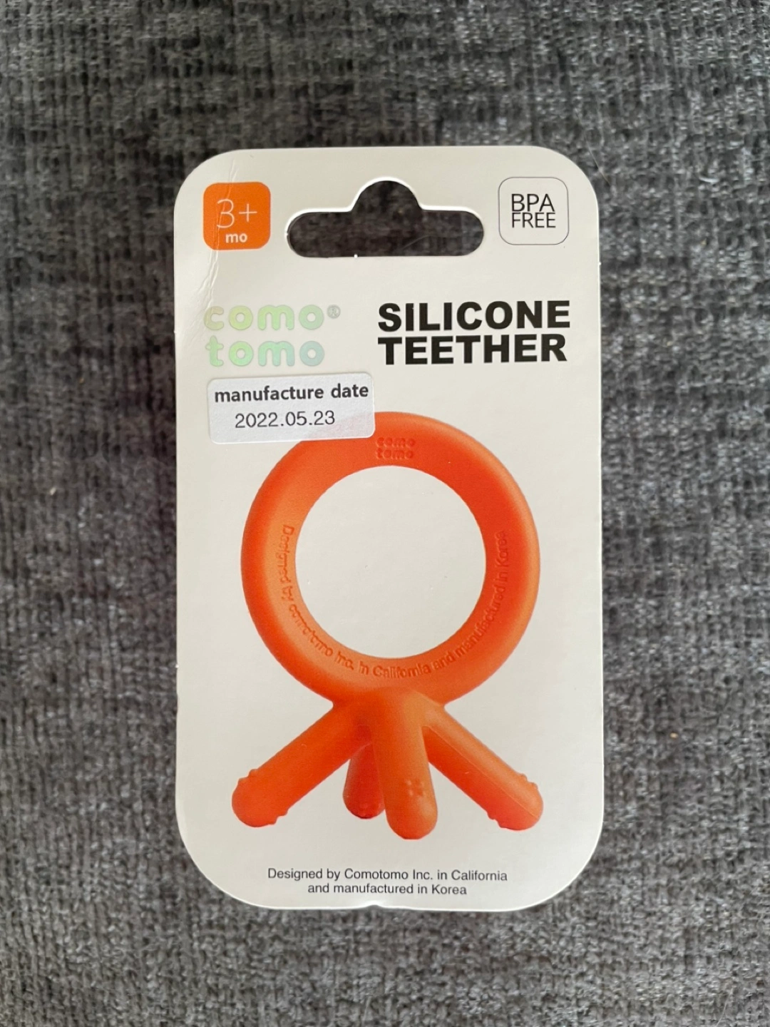 Orange silicone teether for babies 3+ months. BPA free. Designed in California, manufactured in Korea. New in package.