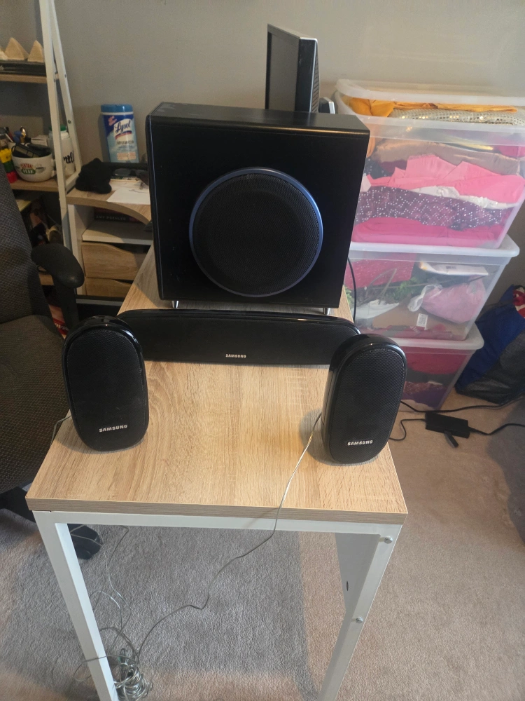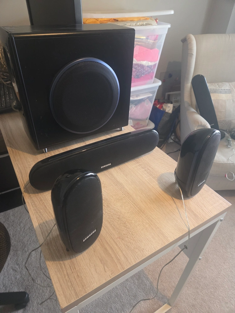 Selling a Samsung PS-WXQ100 subwoofer speaker system. It includes the subwoofer, sound bar, and four speakers. Great for enhancing your home theatre experience!