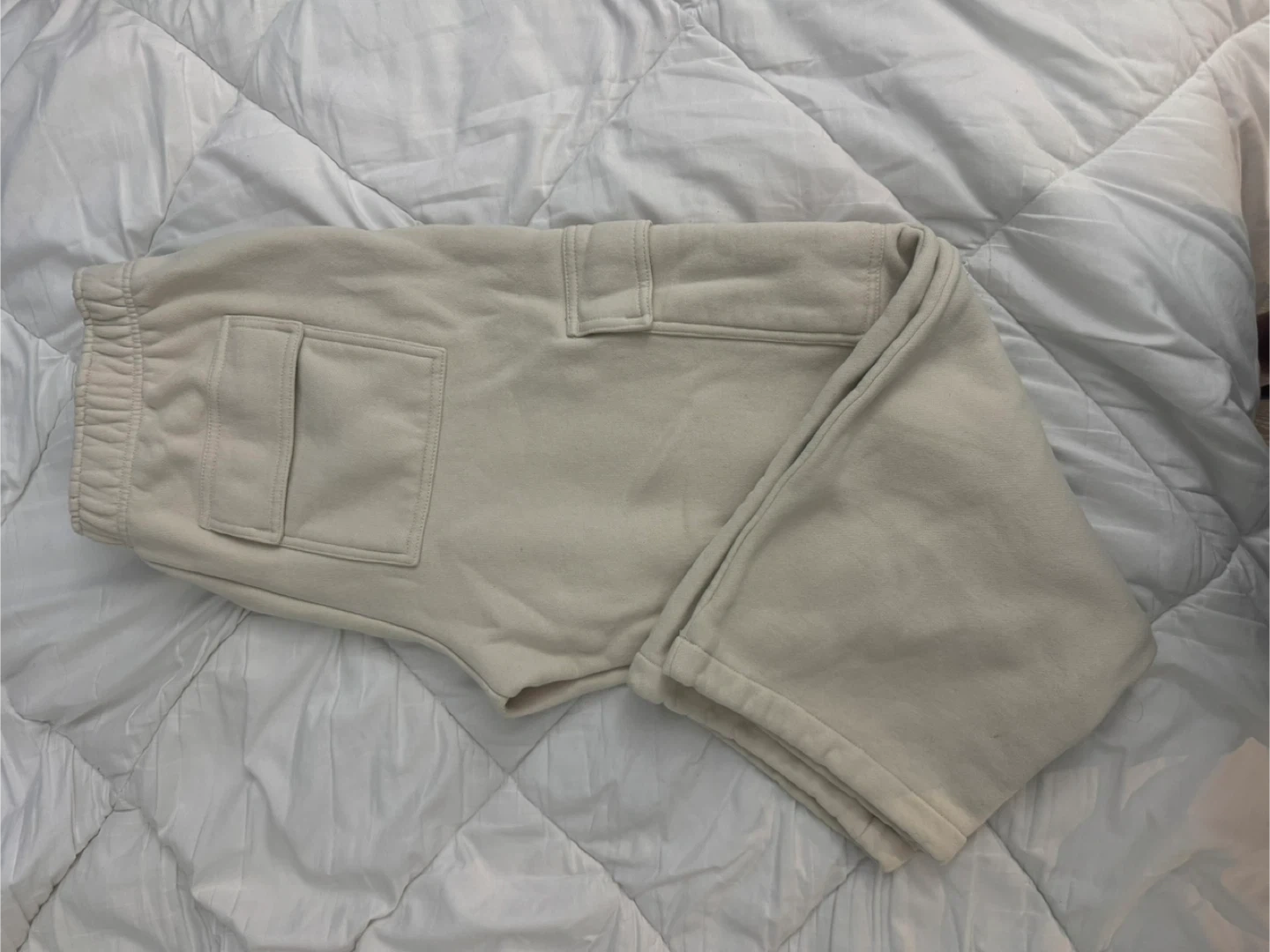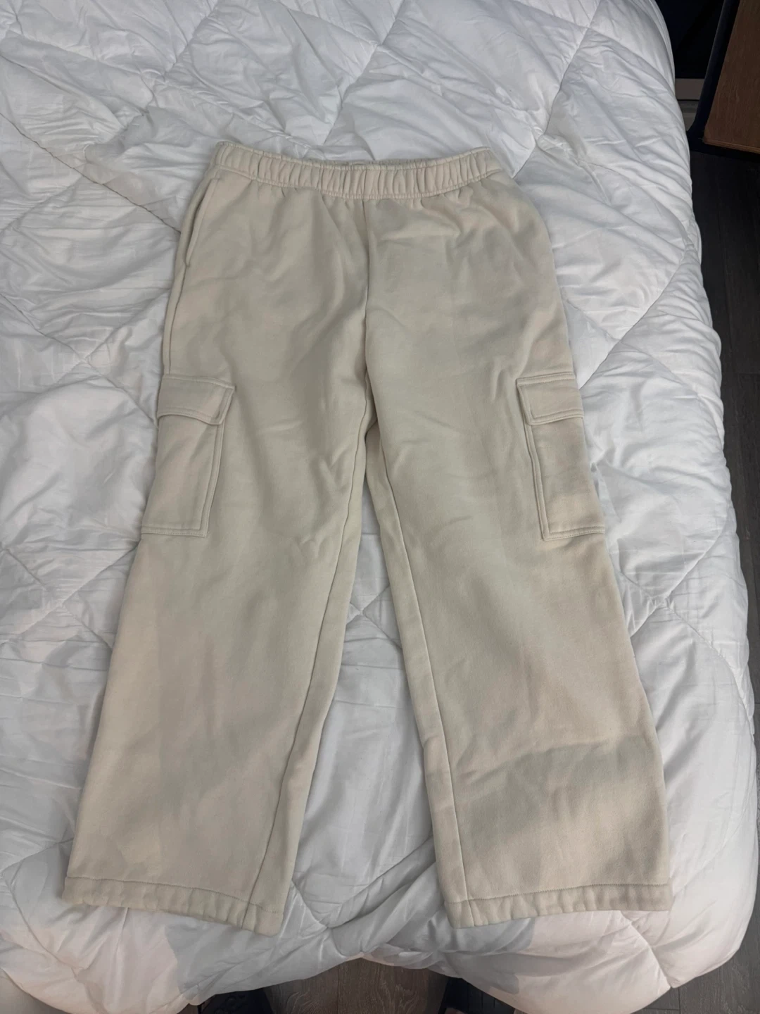 These Oak + Fort sweatpants are a comfy beige colour. They feature cargo pockets on the sides and two back pockets. These pants are made from a soft material for everyday wear.