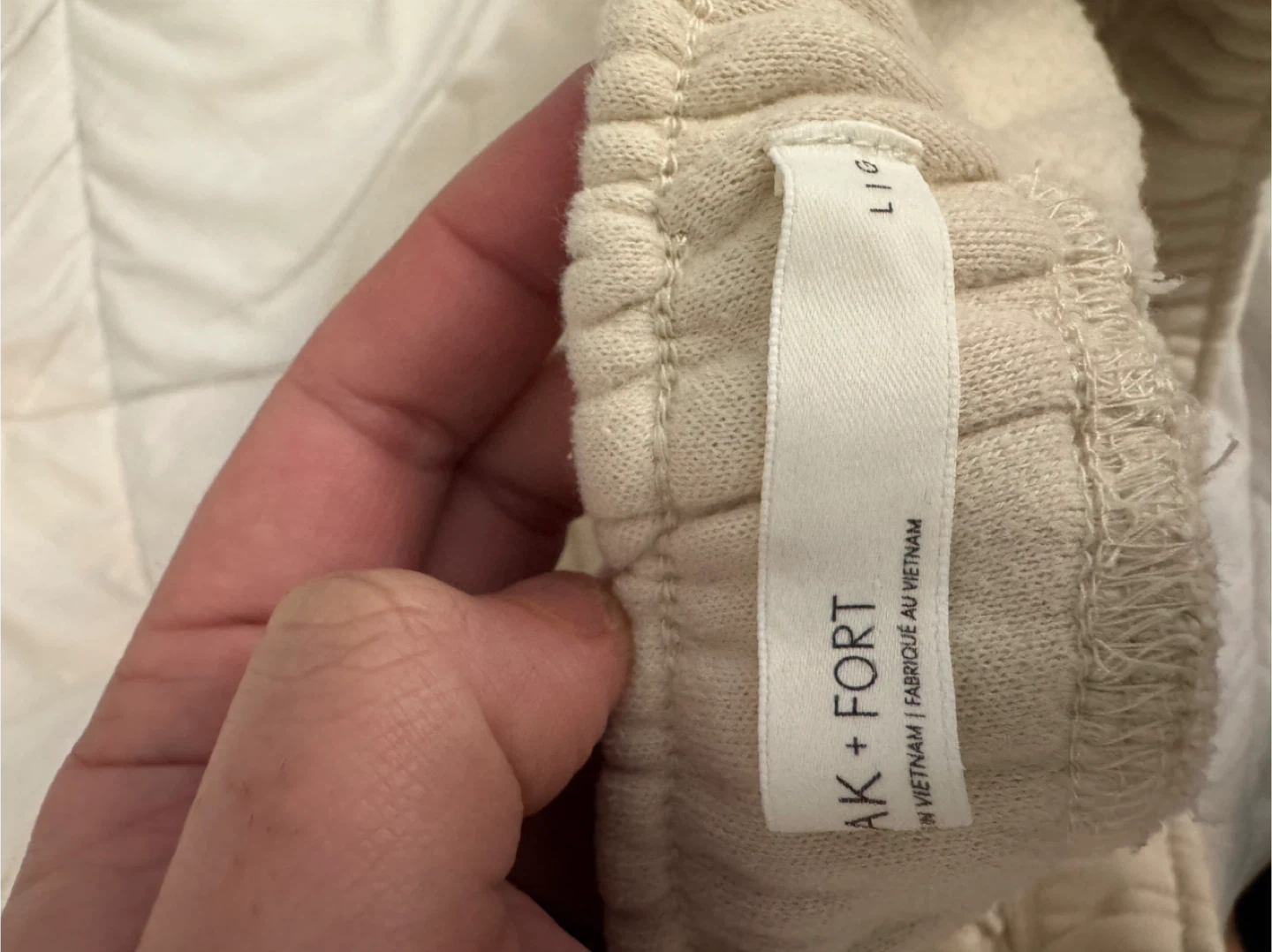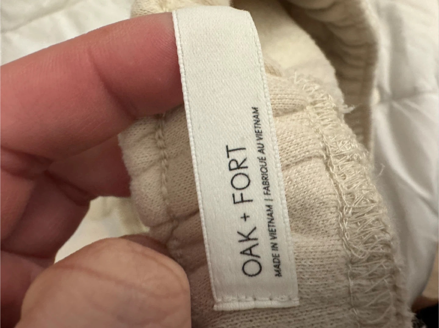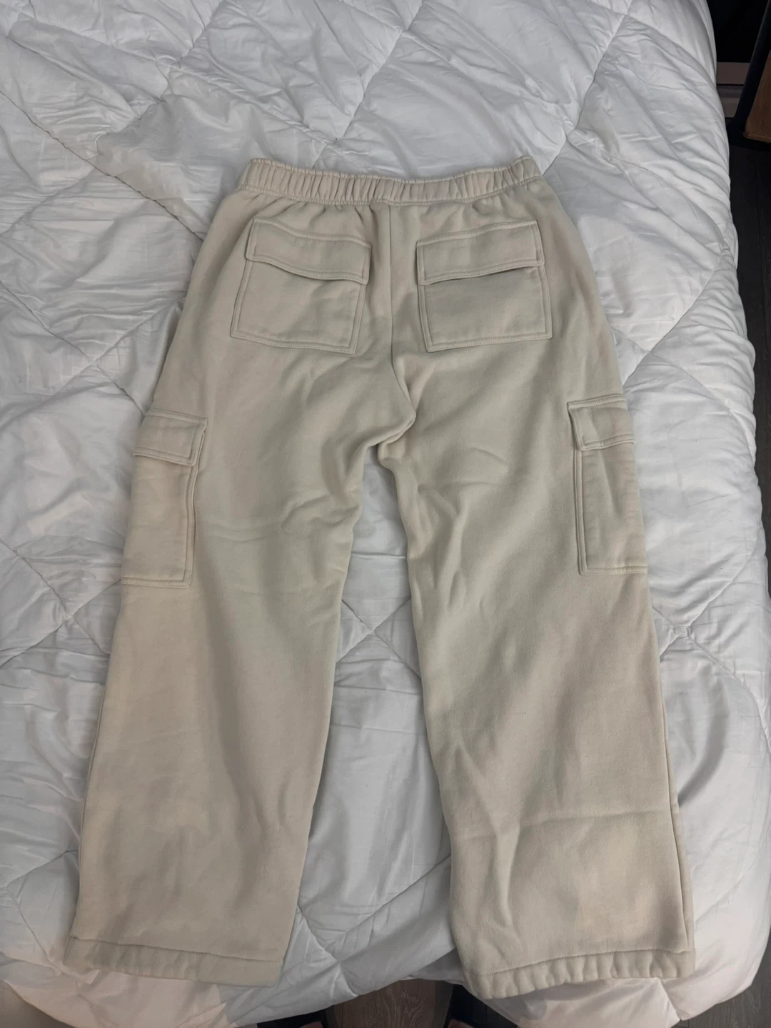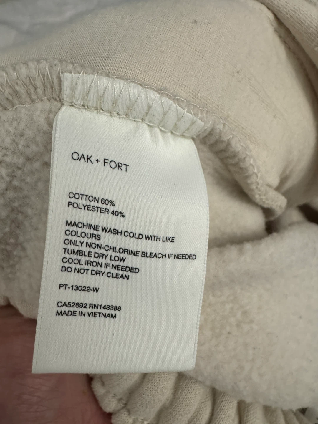 These Oak + Fort sweatpants are a comfy beige colour. They feature cargo pockets on the sides and two back pockets. These pants are made from a soft material for everyday wear.