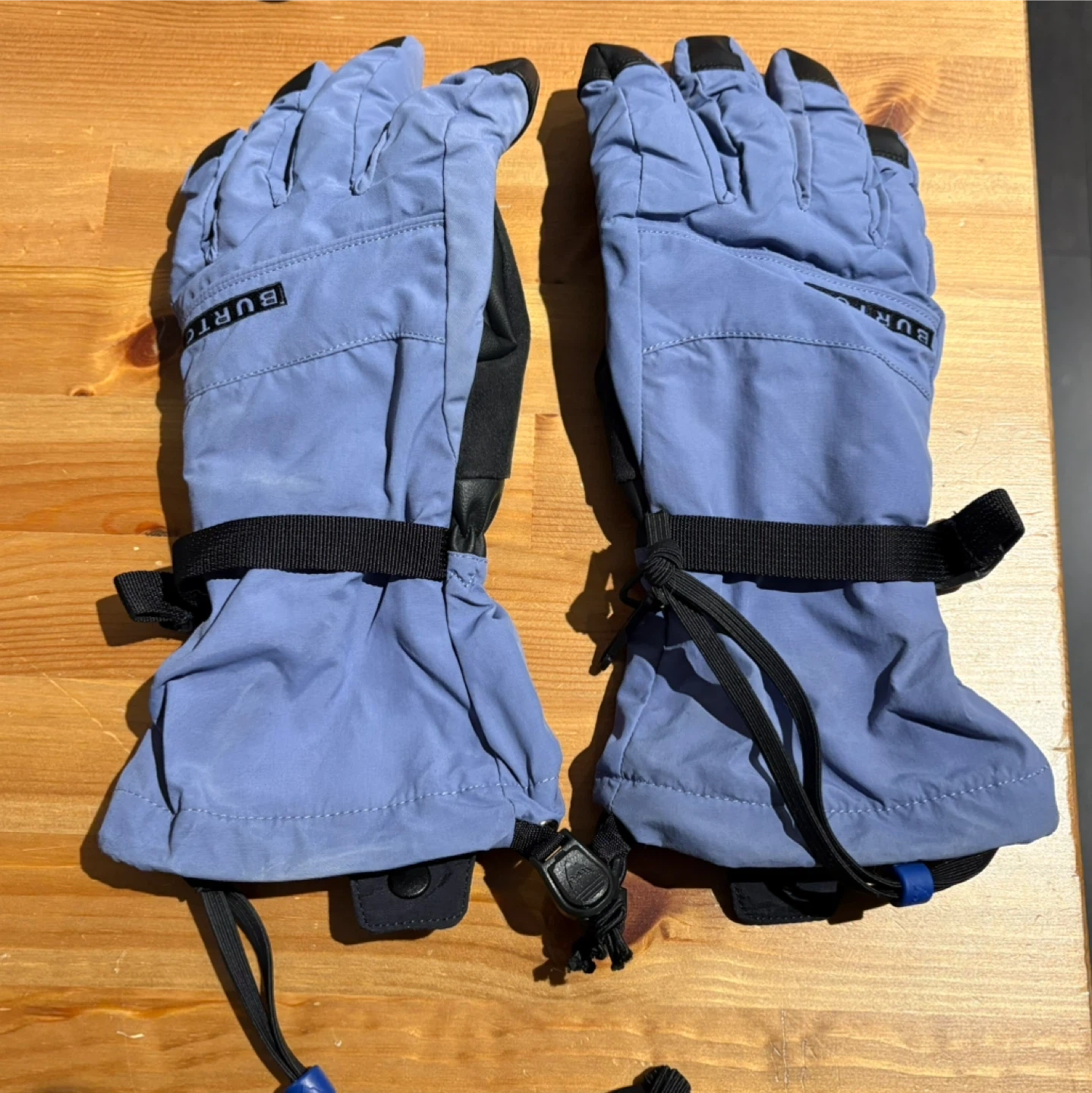 These are Womens Burton Profile gloves in Periwinkle (blue/purple) size M. They feature adjustable wrist straps and cinching cuffs to keep the snow out. Ideal for winter sports!