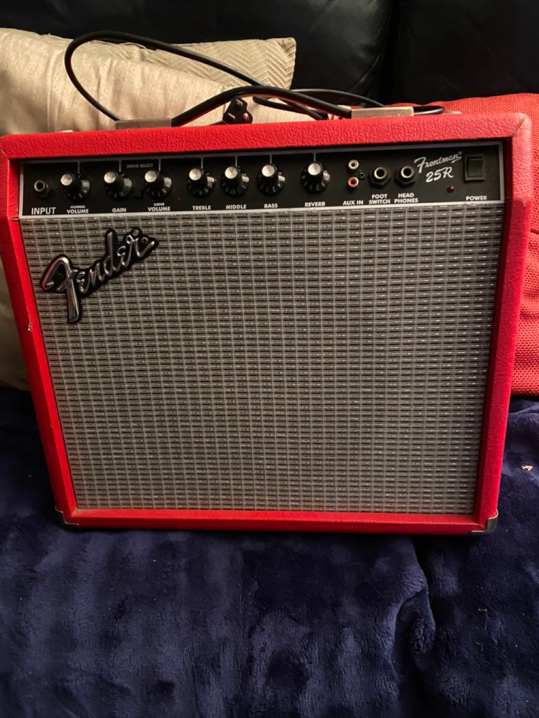 Fender Frontman 25R guitar amplifier. Features include normal and drive channels, gain, volume, treble, middle, bass, and reverb controls. This amp's red tolex is in good condition.