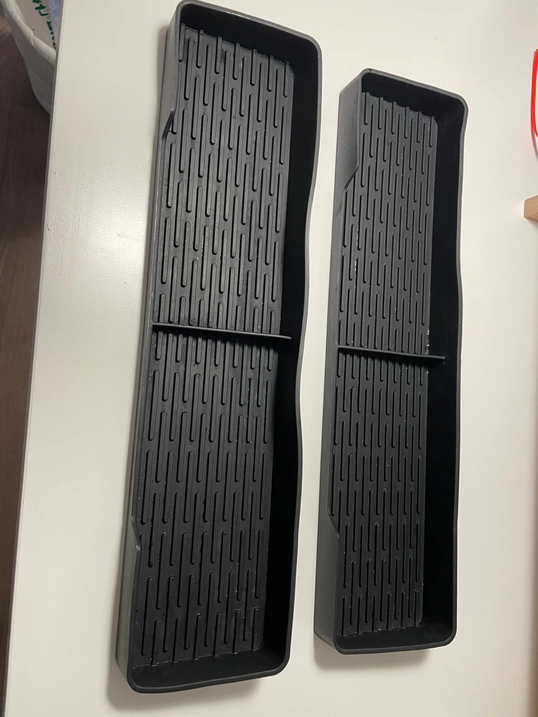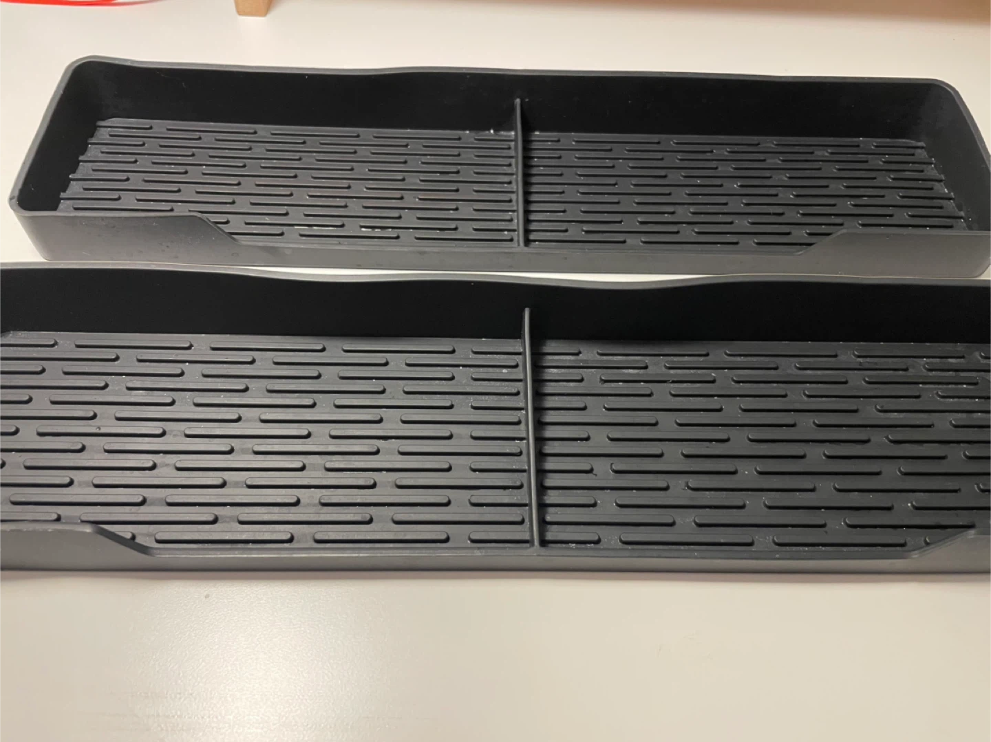 Set of two black silicone stove top shelf liners. These magnetic, slip-proof liners attach effortlessly to your stove. They're made of durable silicone material.