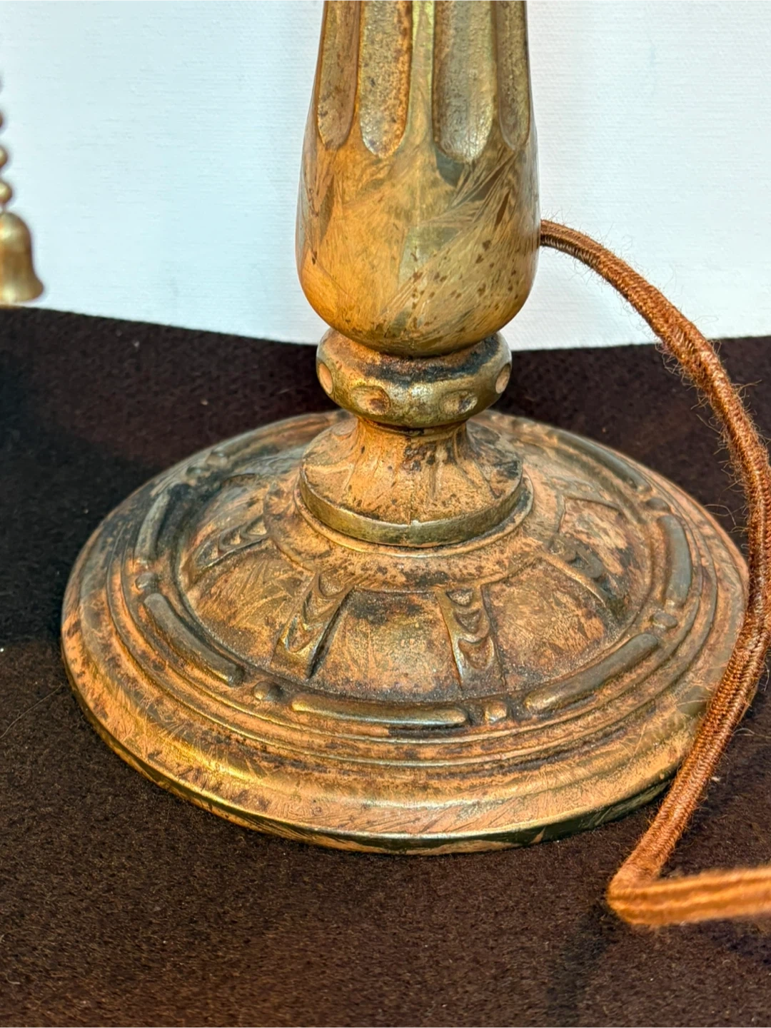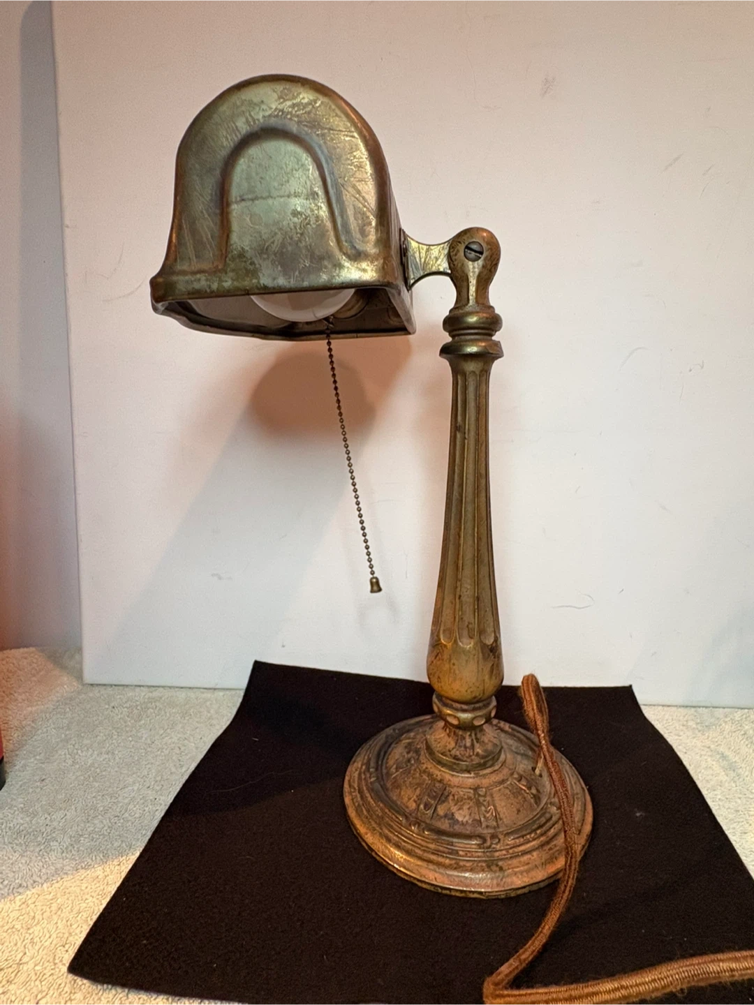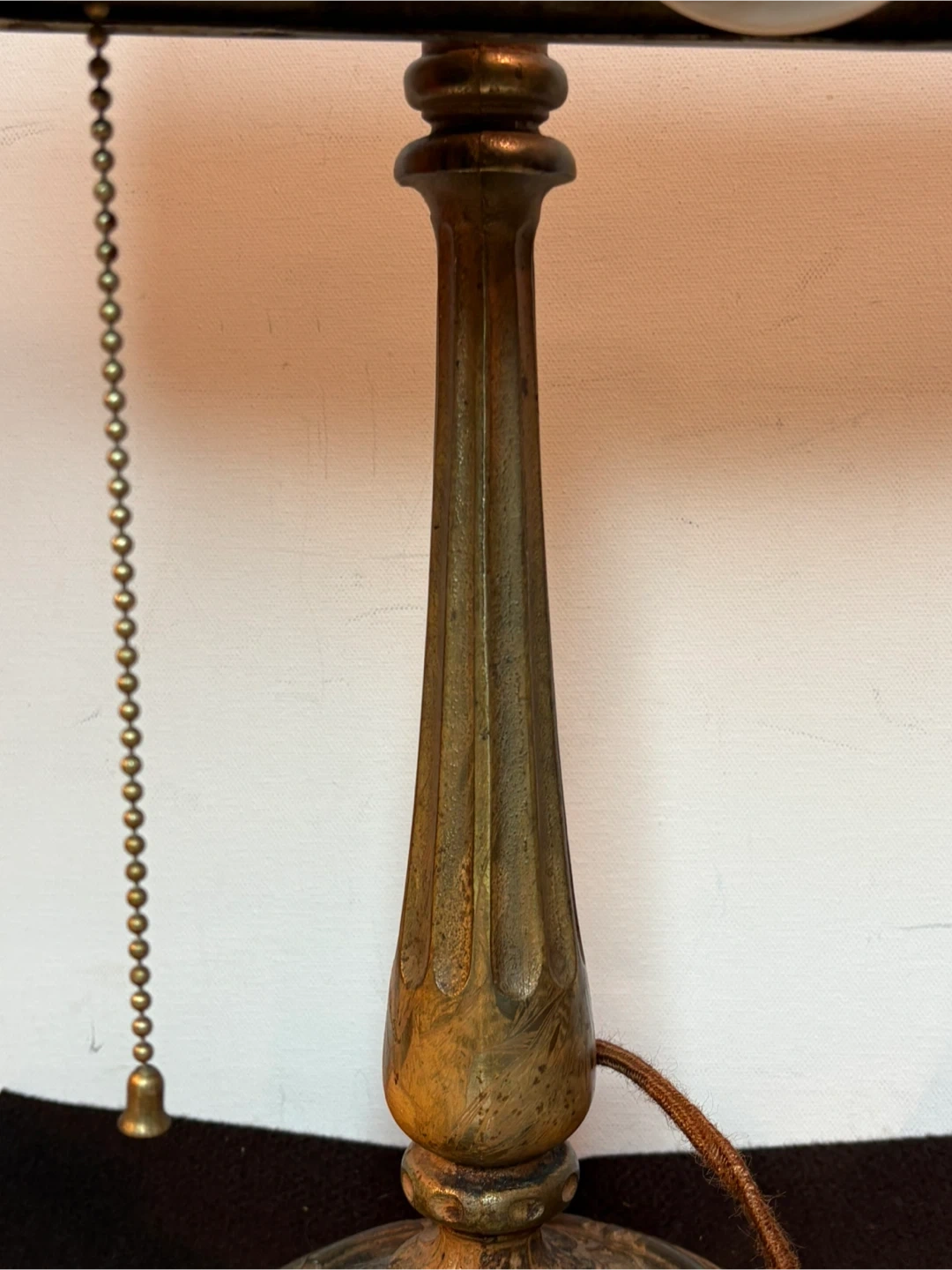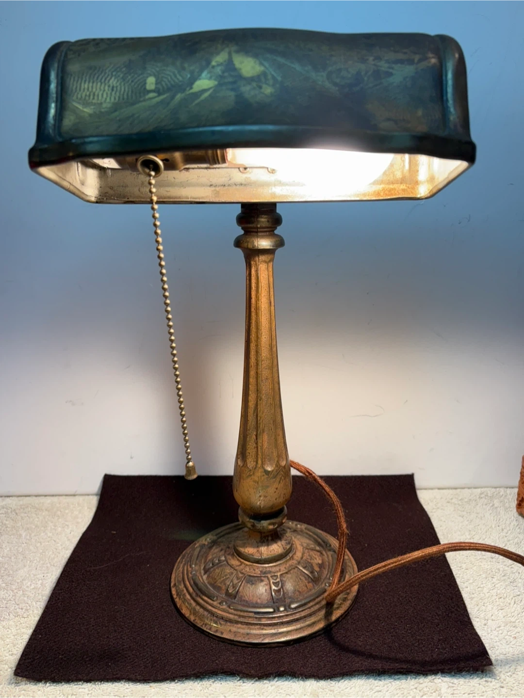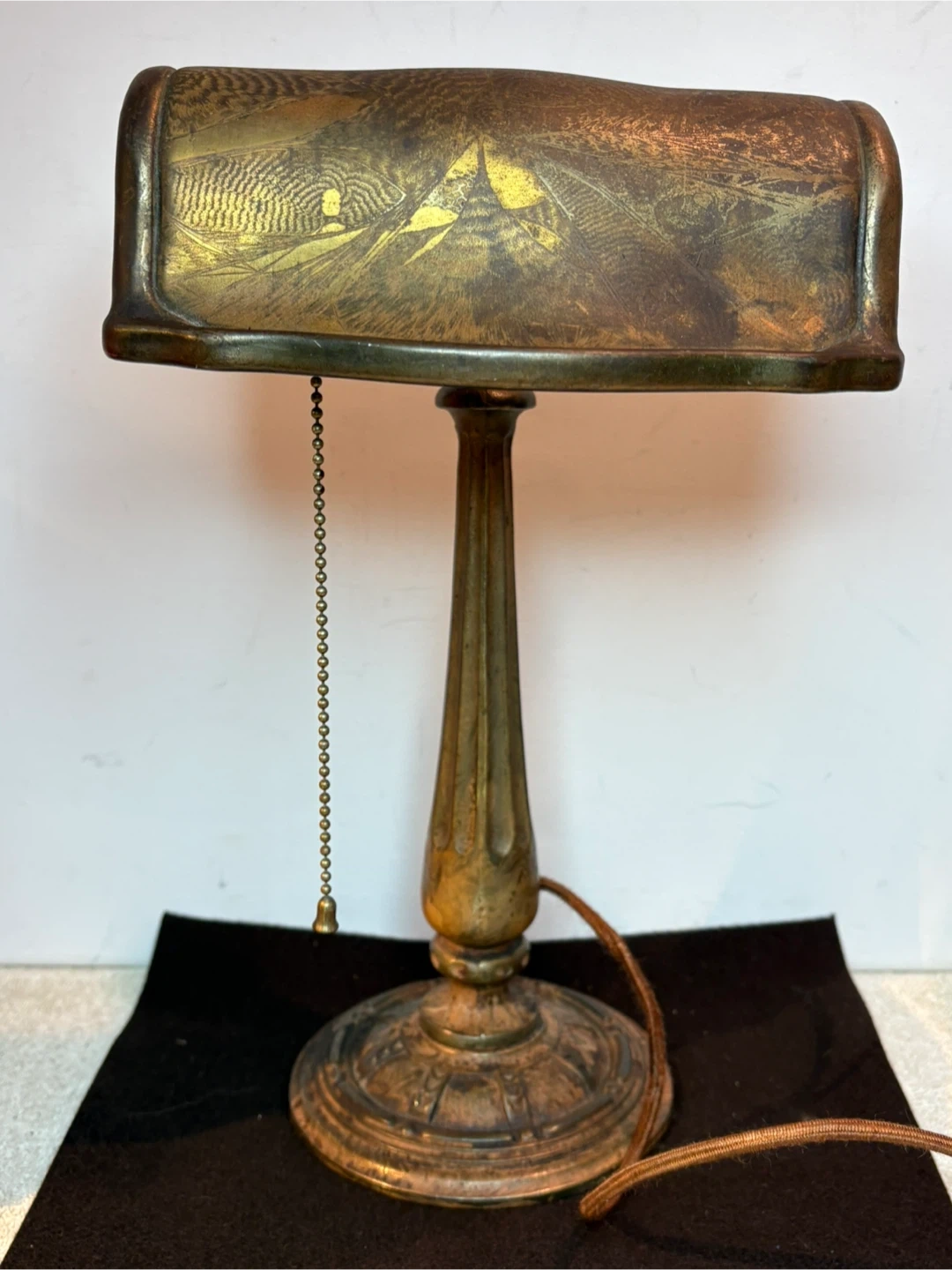 This vintage banker's lamp features an ornate cast base and stem. Decorated with a brass finish . It has a pull-chain switch for easy operation. Its classic design makes it a great addition to any desk or study. Has original wiring which works , could be upgraded though .