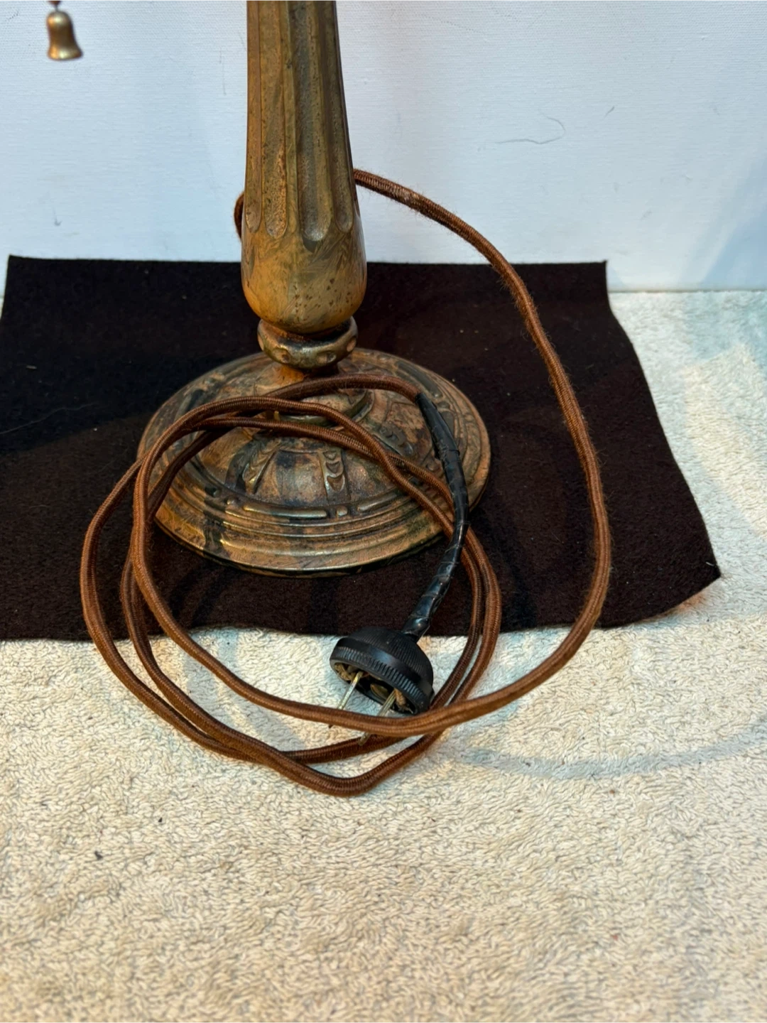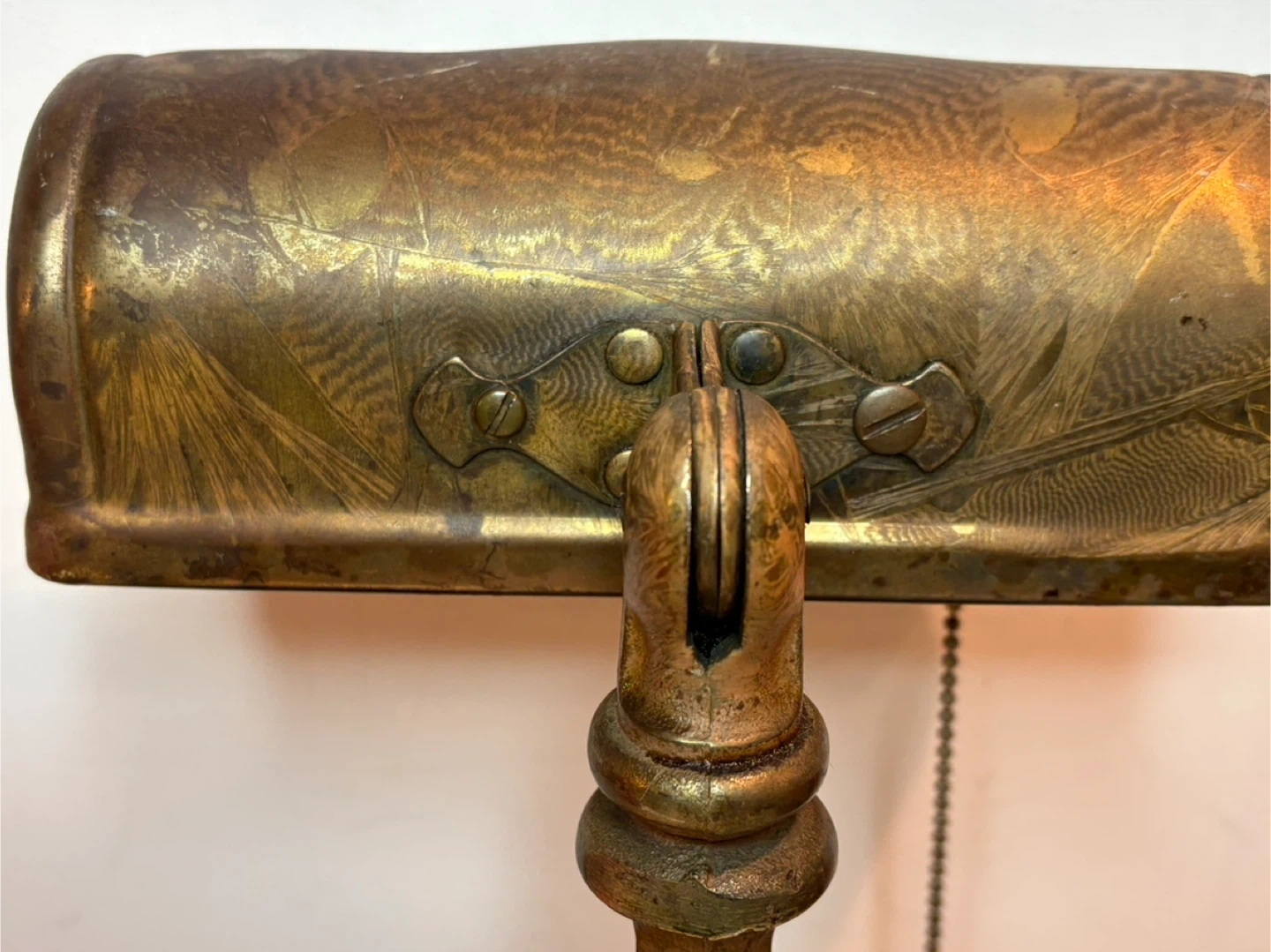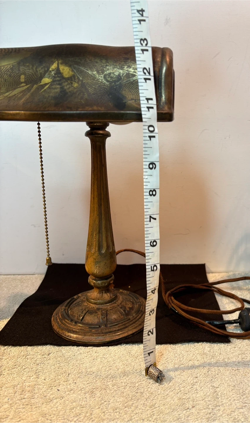 This vintage banker's lamp features an ornate cast base and stem. Decorated with a brass finish . It has a pull-chain switch for easy operation. Its classic design makes it a great addition to any desk or study. Has original wiring which works , could be upgraded though .