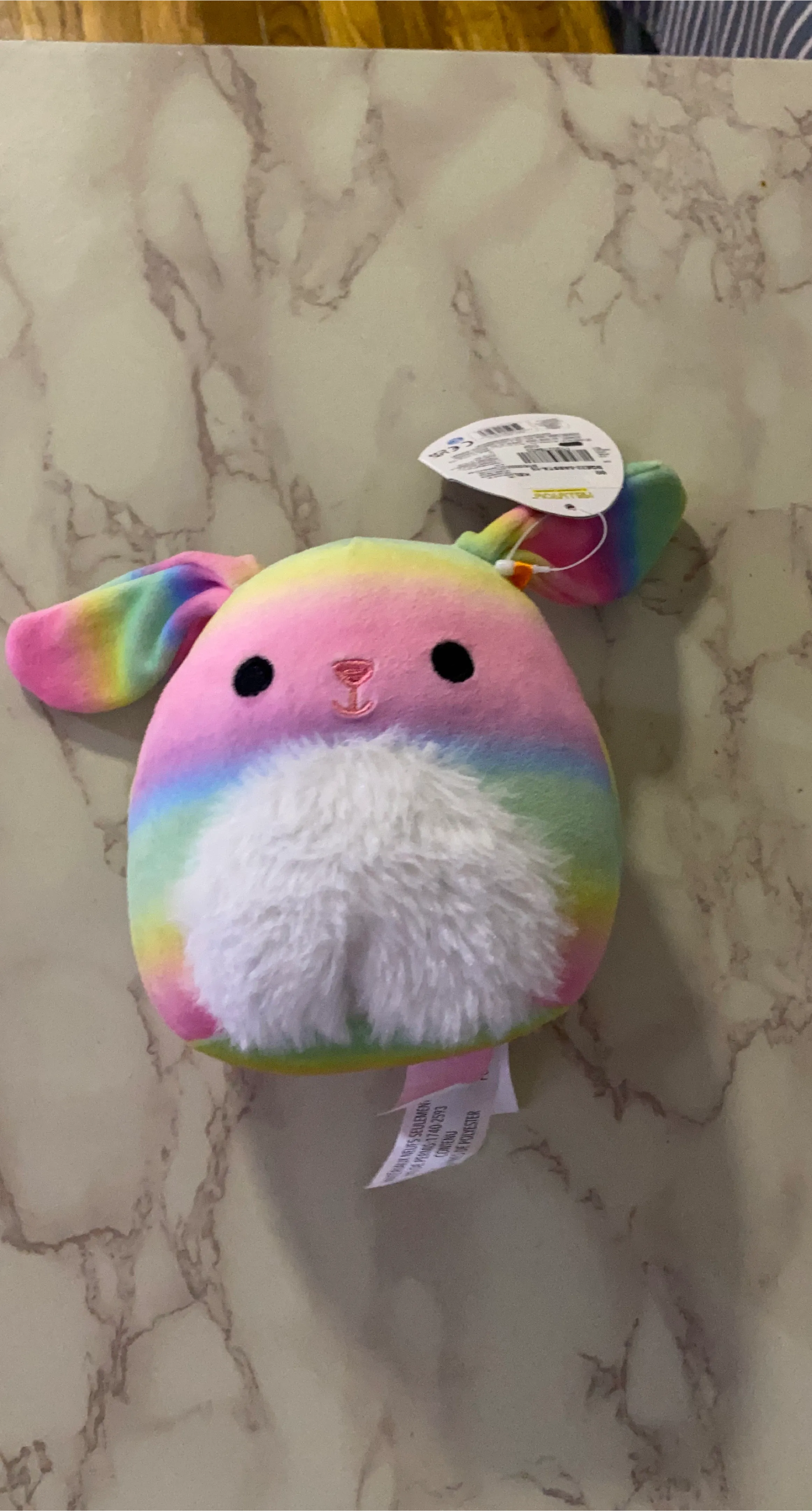 This is a Squishmallows rainbow bunny plush toy. It's super soft and squishy! Made with polyester fiber. Perfect for cuddles!