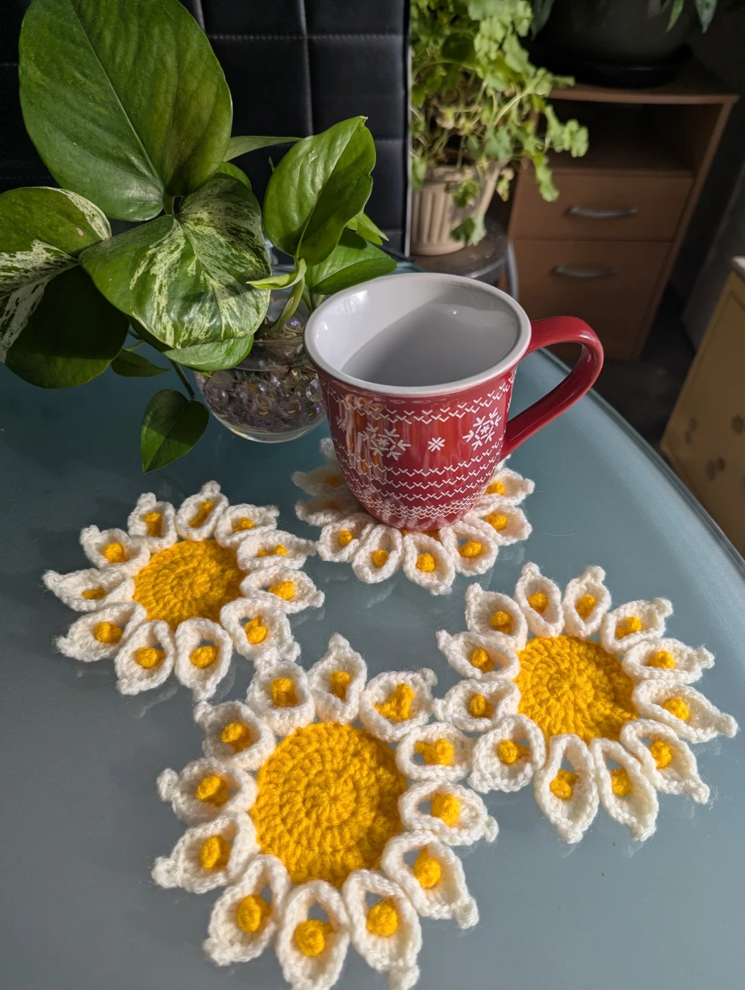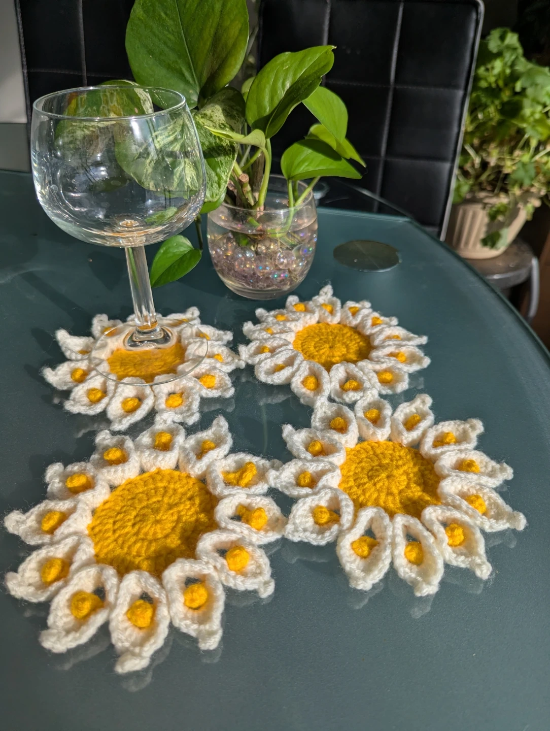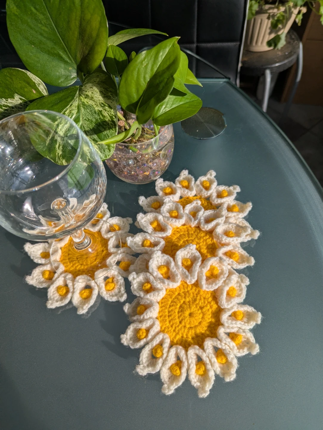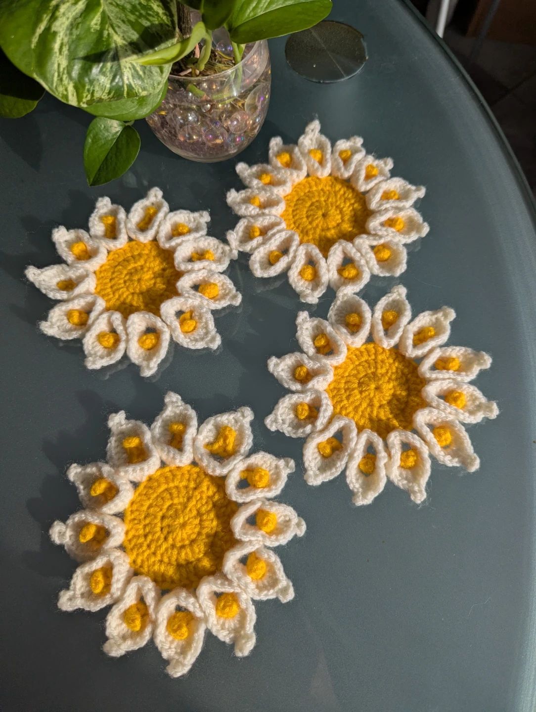 Here are four handmade crochet daisy coasters! They're perfect for adding a touch of sunshine to your coffee table or protecting your surfaces from drink rings. These coasters feature a cheerful yellow center surrounded by white petals, all lovingly crocheted by hand