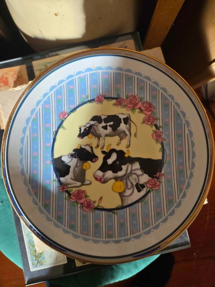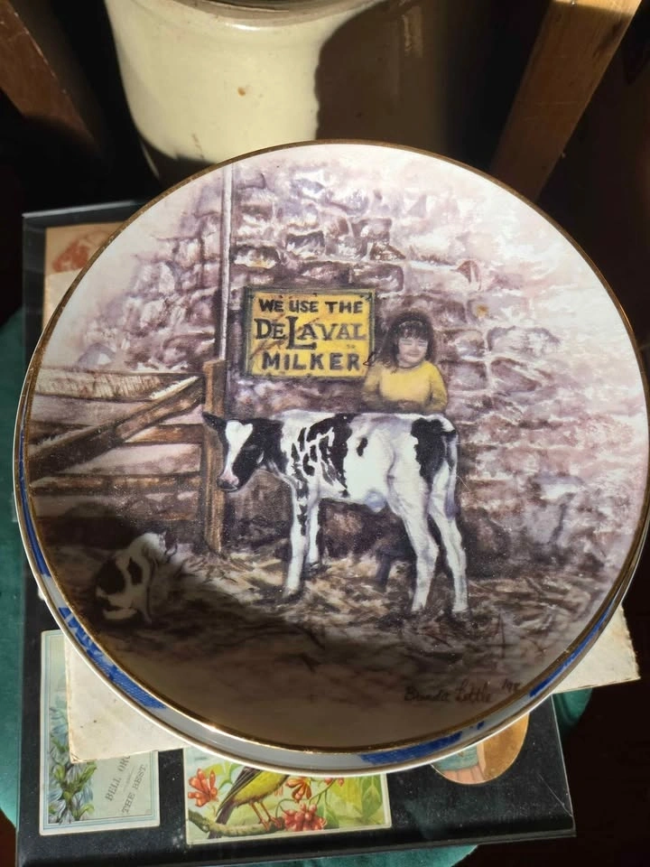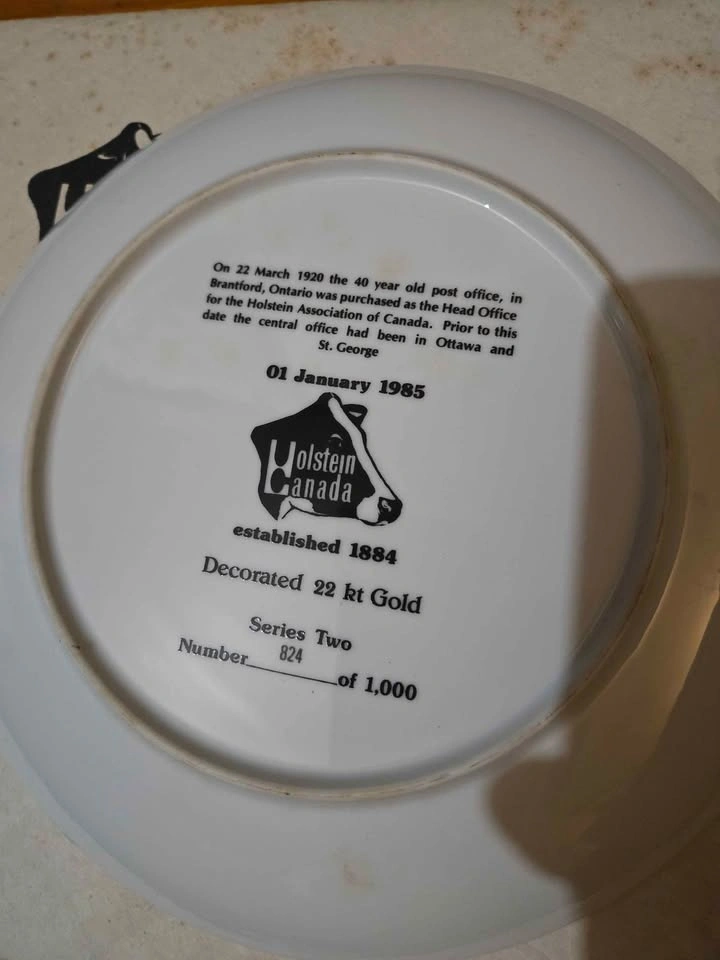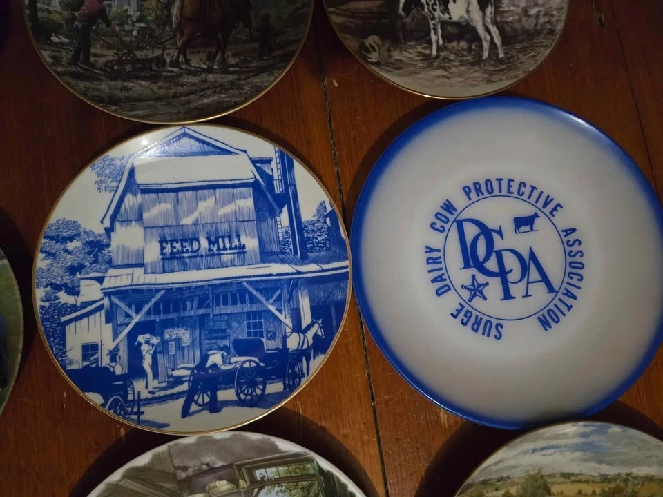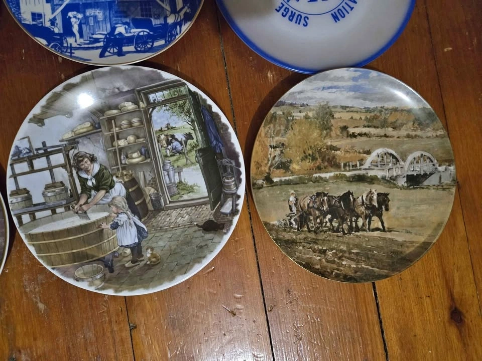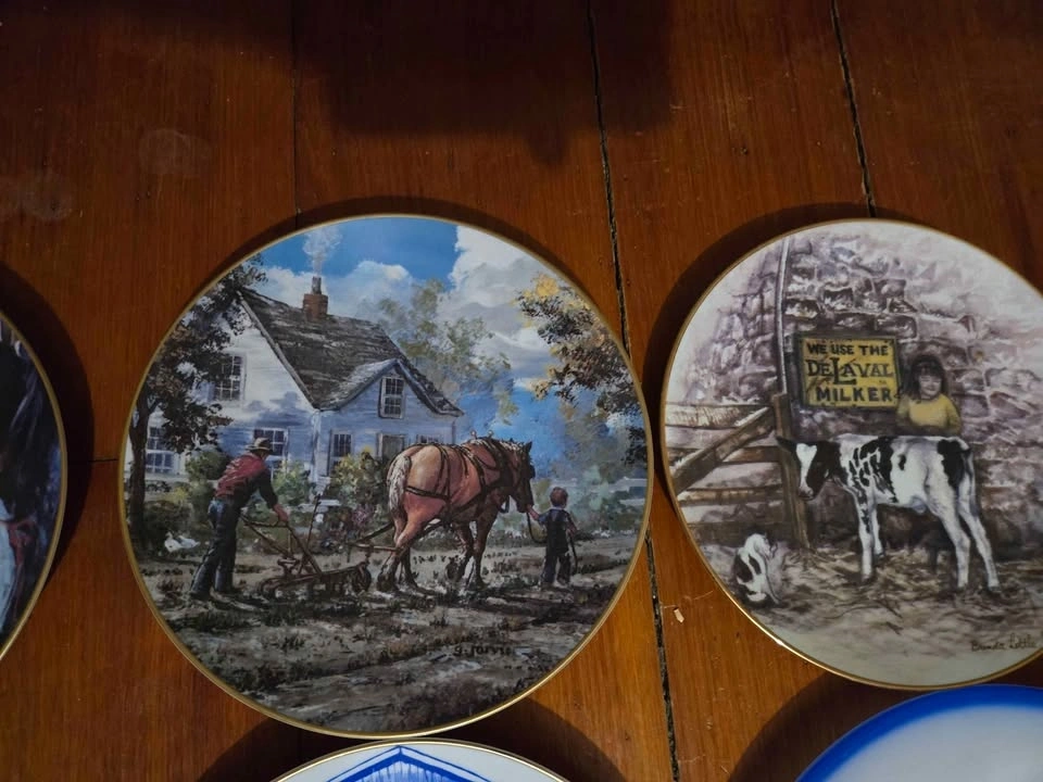 Collection of 14 farm-themed collector plates. Prices: Holstein Canada (with box) - $20, Delaval milker - $20, all others - $5 each. Take all 14 for $80. Pick up 4 miles south east of Tavistock.