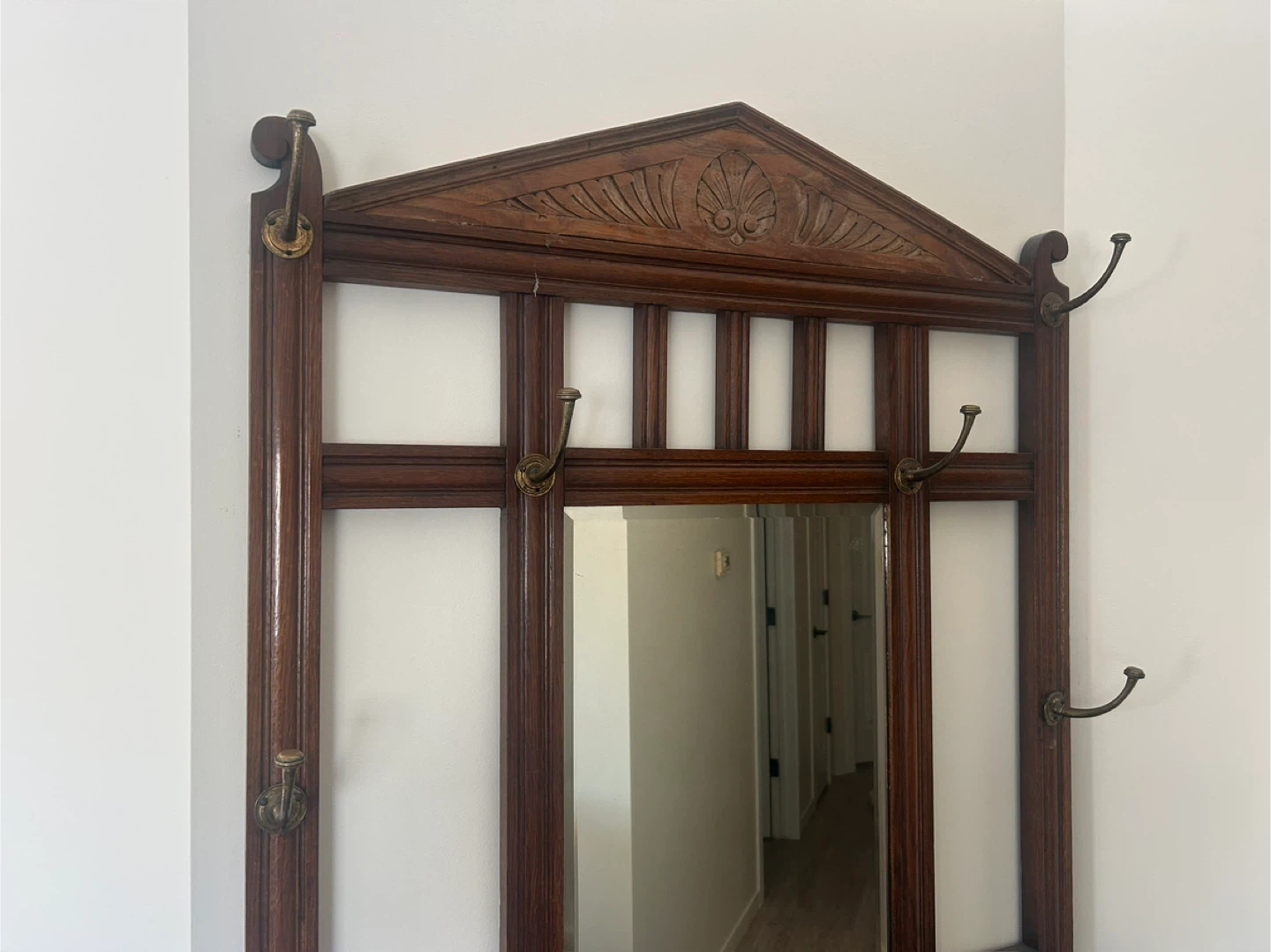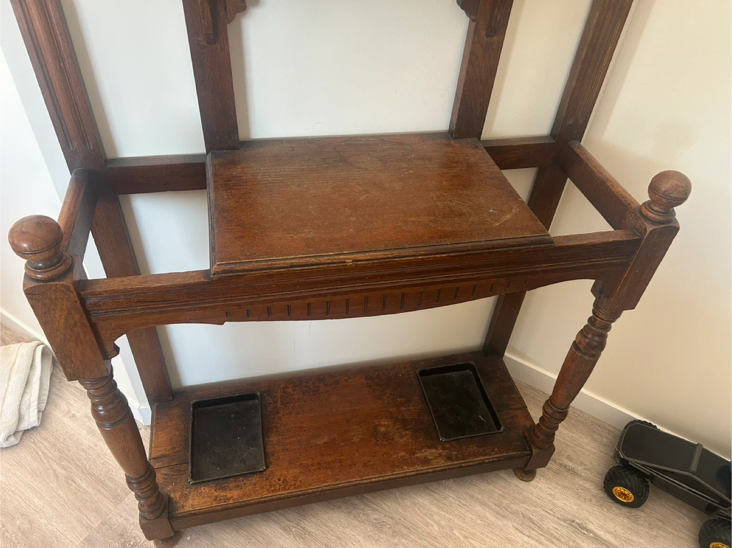 This vintage hall tree features a mirror, multiple coat hooks, and a convenient lower shelf. It has two integrated trays, perfect for holding umbrellas or walking sticks. A lovely addition to any entryway or mudroom!