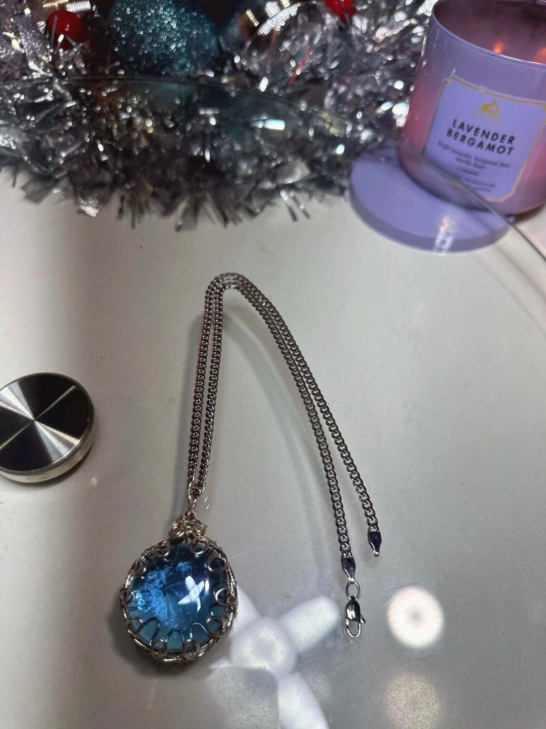Here's a beautiful blue stone pendant necklace! The stone is a lovely shade of blue and the chain is a classic silver color. It's in great condition and ready to wear