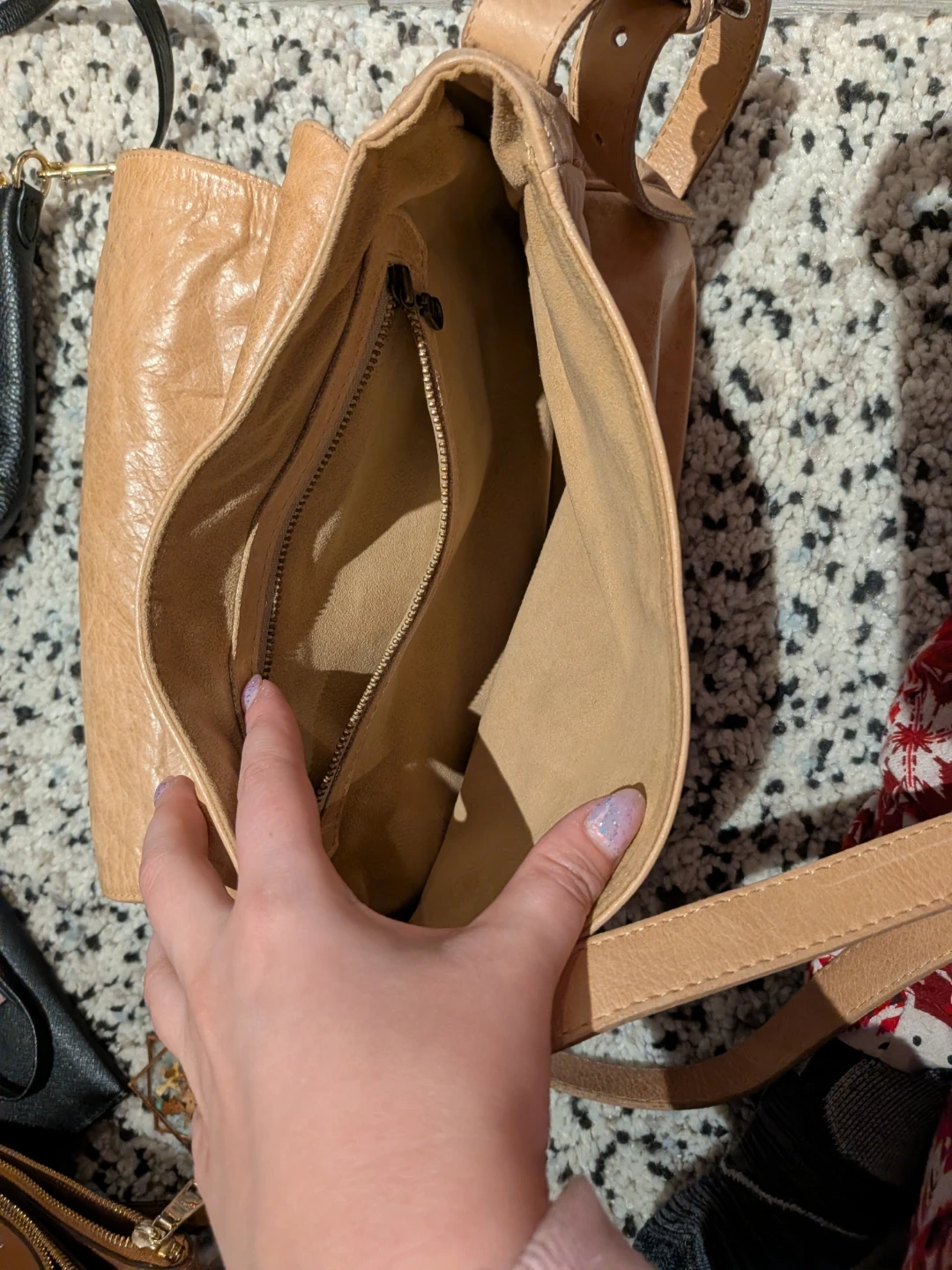 Tan leather shoulder bag with a front panel made of cowhide. It has a zippered interior pocket and a top flap closure. Great for carrying your essentials!