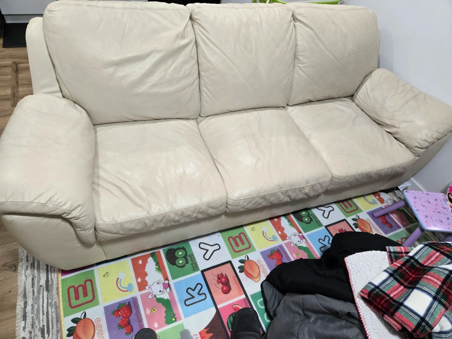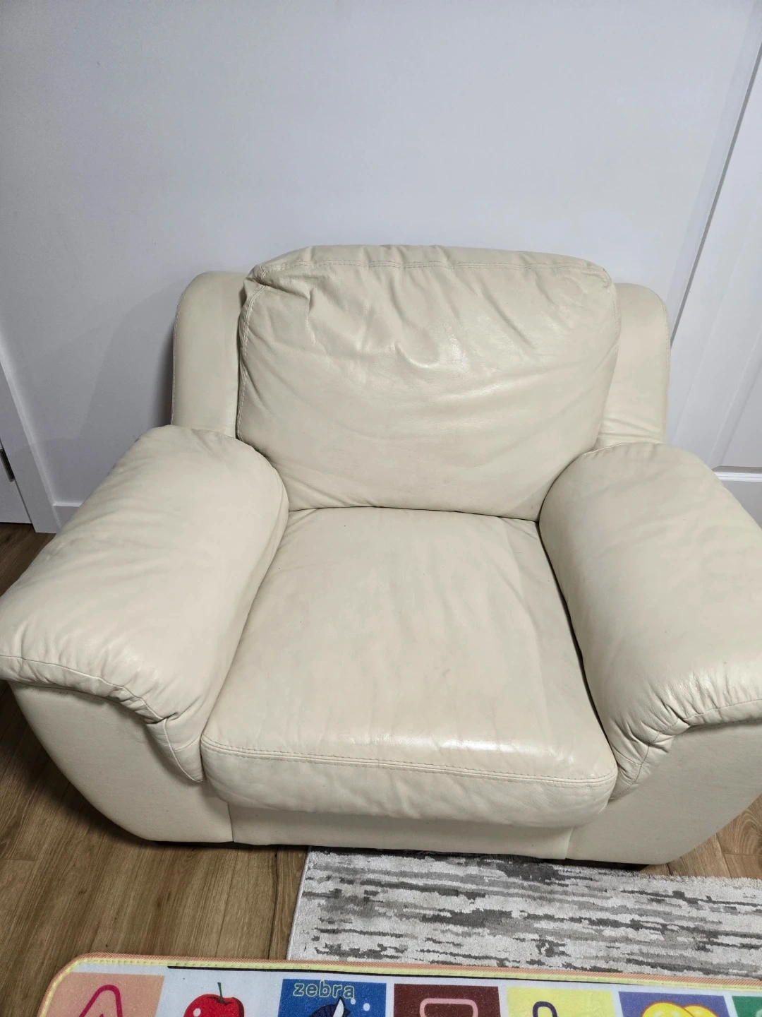 Cream-coloured leather sofa with three cushions and matching armchair. Plush seating and padded arms. This set's a comfy addition to any living space!