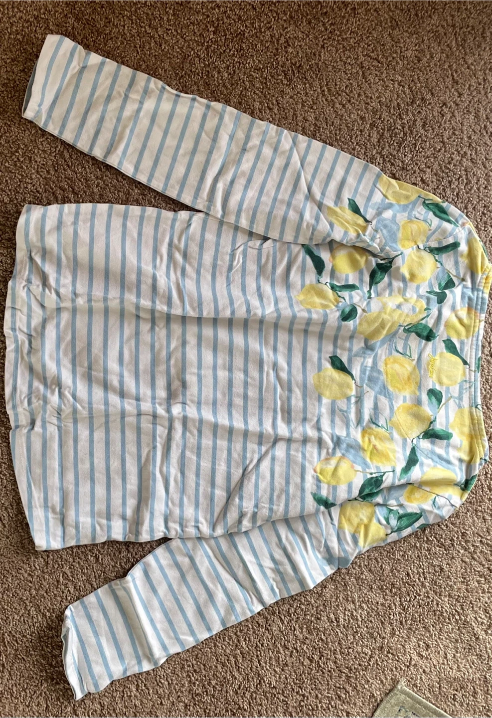 Joules long-sleeved top with blue and white stripes and a lemon print. It's a UK size 12. This top's perfect for adding a pop of colour to your everyday outfits!
