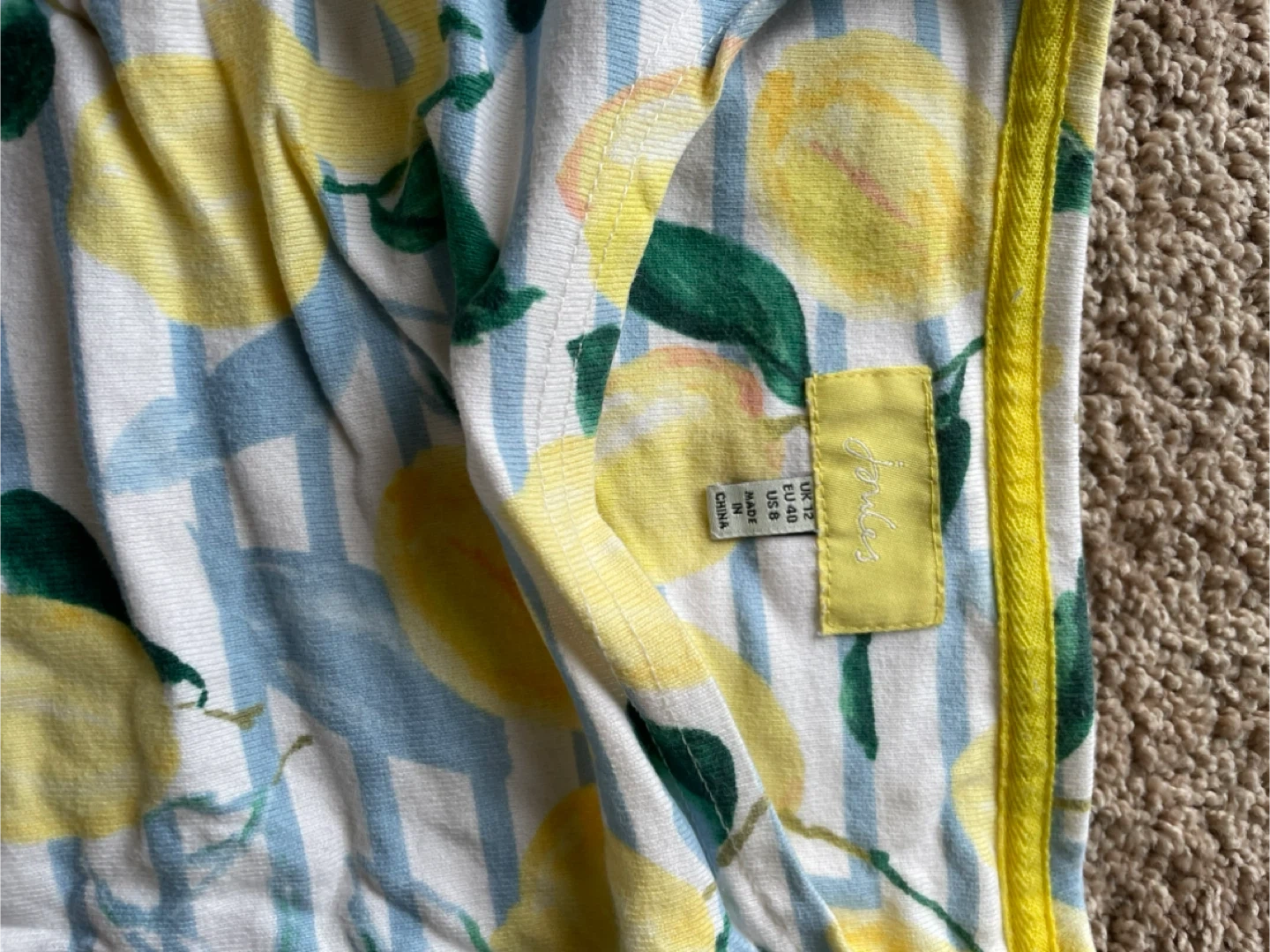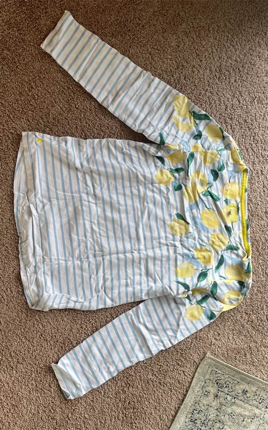Joules long-sleeved top with blue and white stripes and a lemon print. It's a UK size 12. This top's perfect for adding a pop of colour to your everyday outfits!
