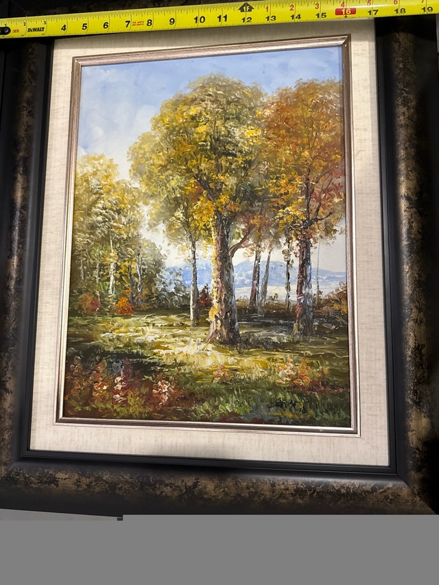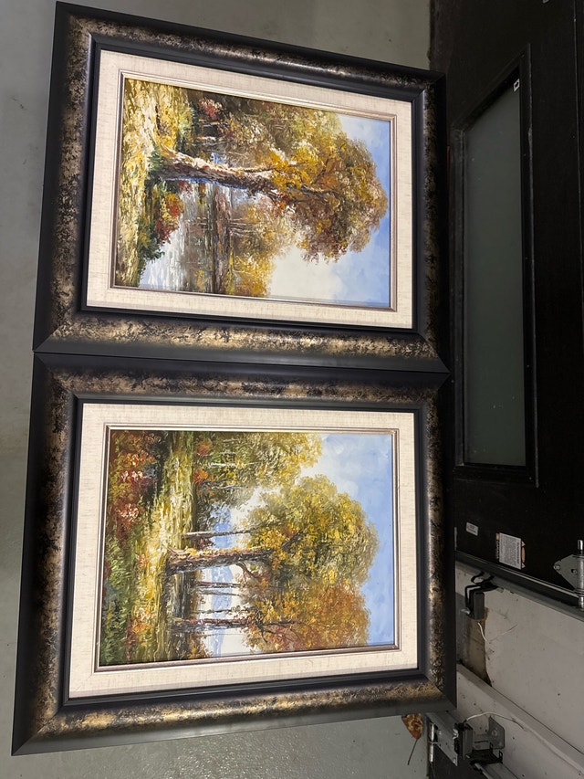 Offering a pair of beautiful framed art pieces, each capturing serene landscapes with vibrant, autumn-toned trees and reflective waters. The frames are ornate and complement the art perfectly. Displayed for staging. Dimensions: Each frame measures approximately 18 inches by 22 inches. Condition: brand new. Style: Traditional landscape art.