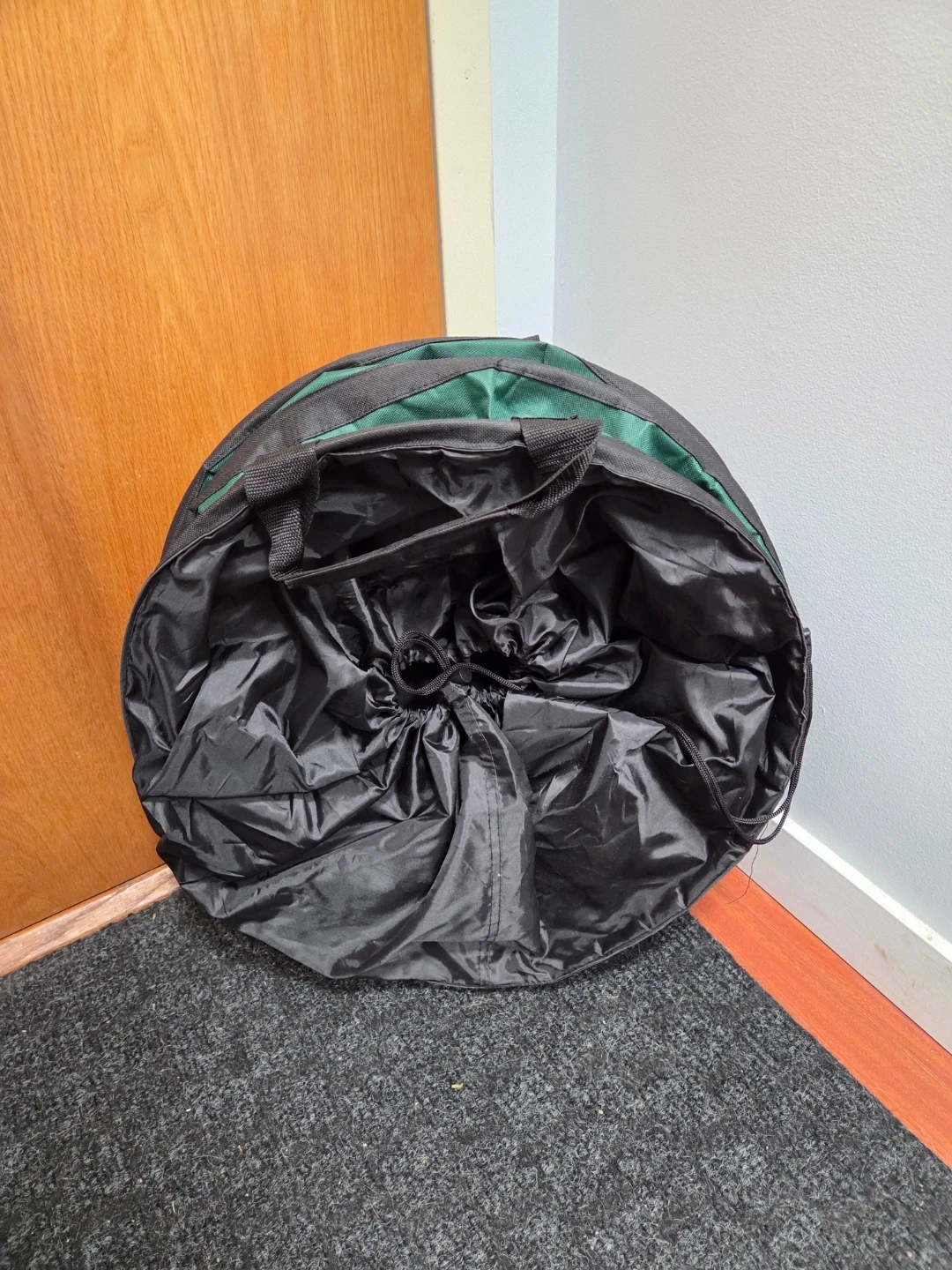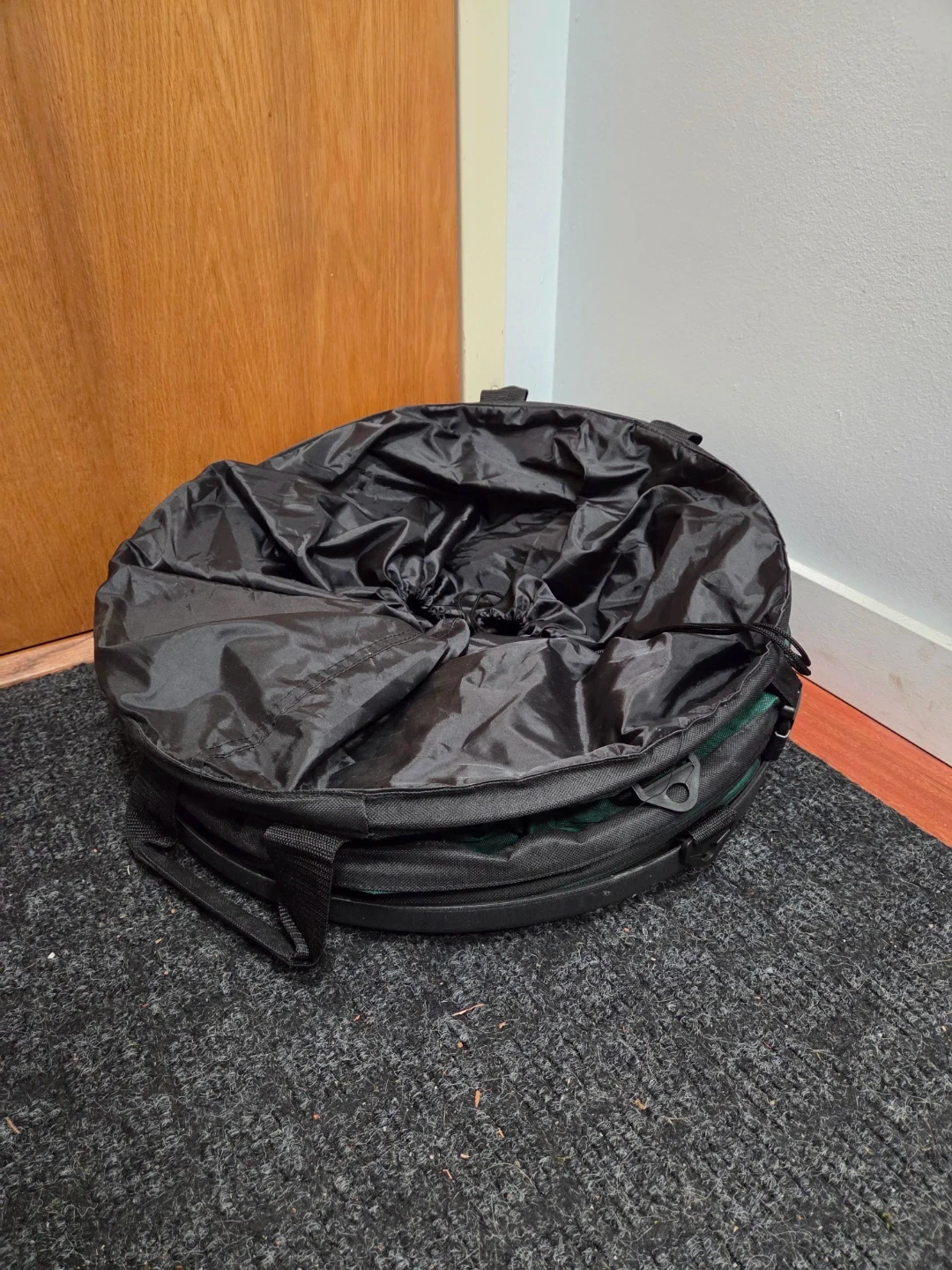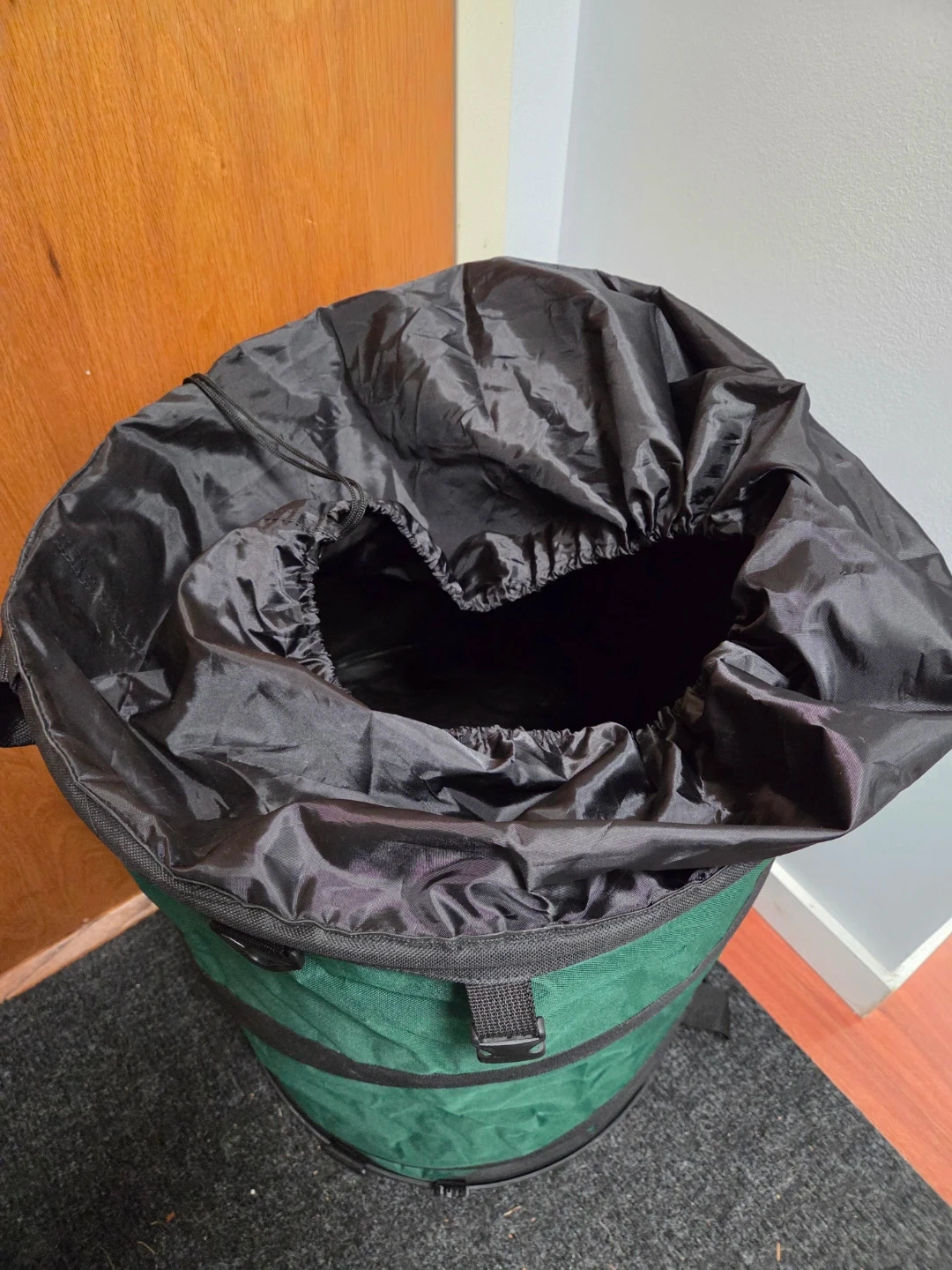 -Collapsible green storage or waste bin with a black drawstring top and carrying handles. It's made of durable fabric and folds flat for easy storage. Great for yard clean-up and gardening tasks!