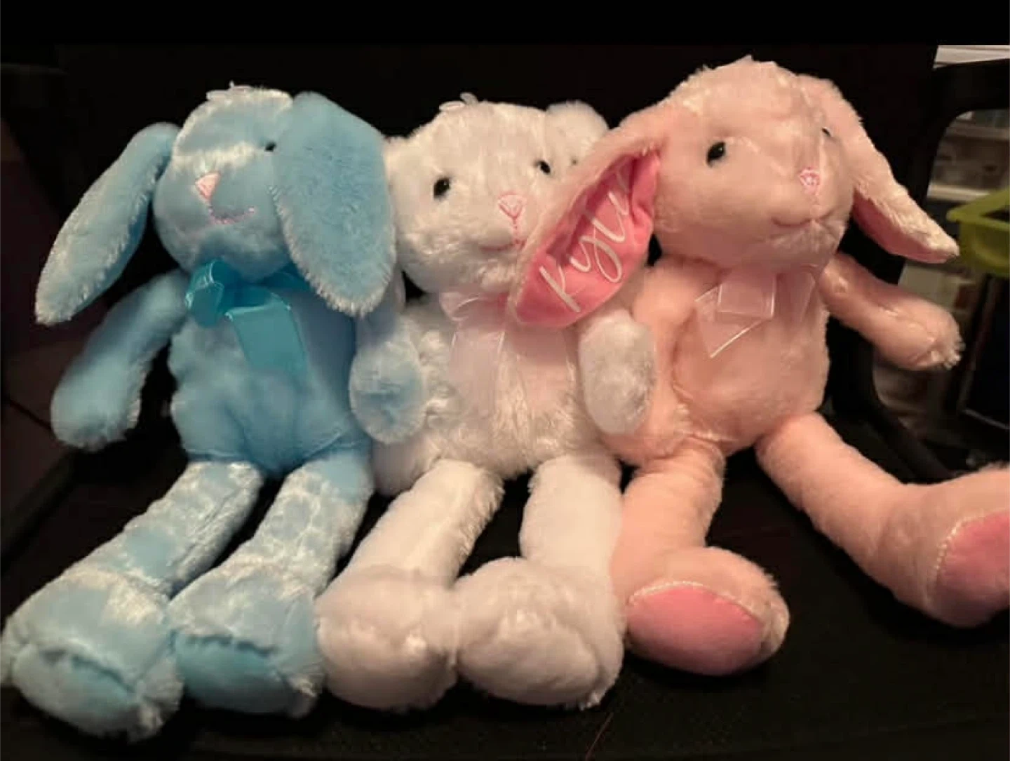 Easter plush bunnies in blue, white, and pink. They're soft and cuddly.