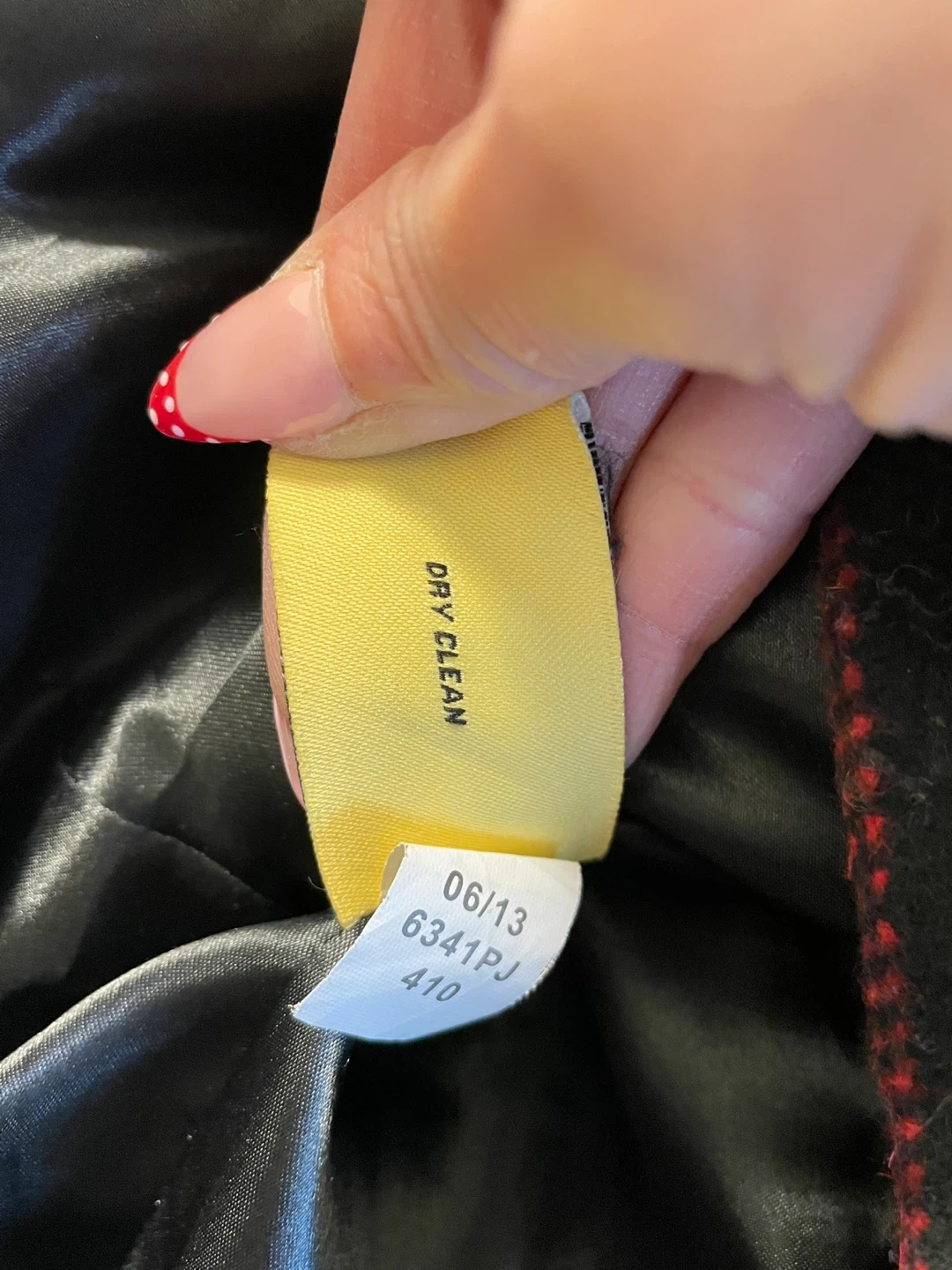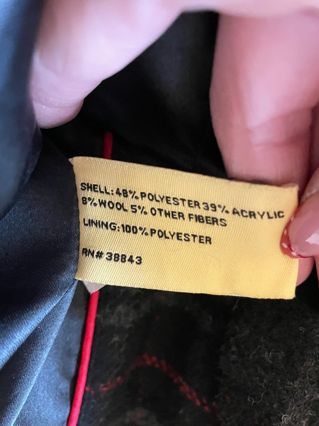 Marlyn & Me pea coat in a grey plaid pattern with red accents. Shell is 48% polyester, 39% acrylic, 8% wool, and 5% other fibers; lining is 100% polyester. Features a belted waist and a removable hood. Dry clean only.