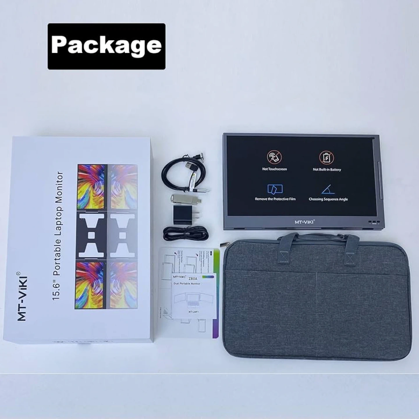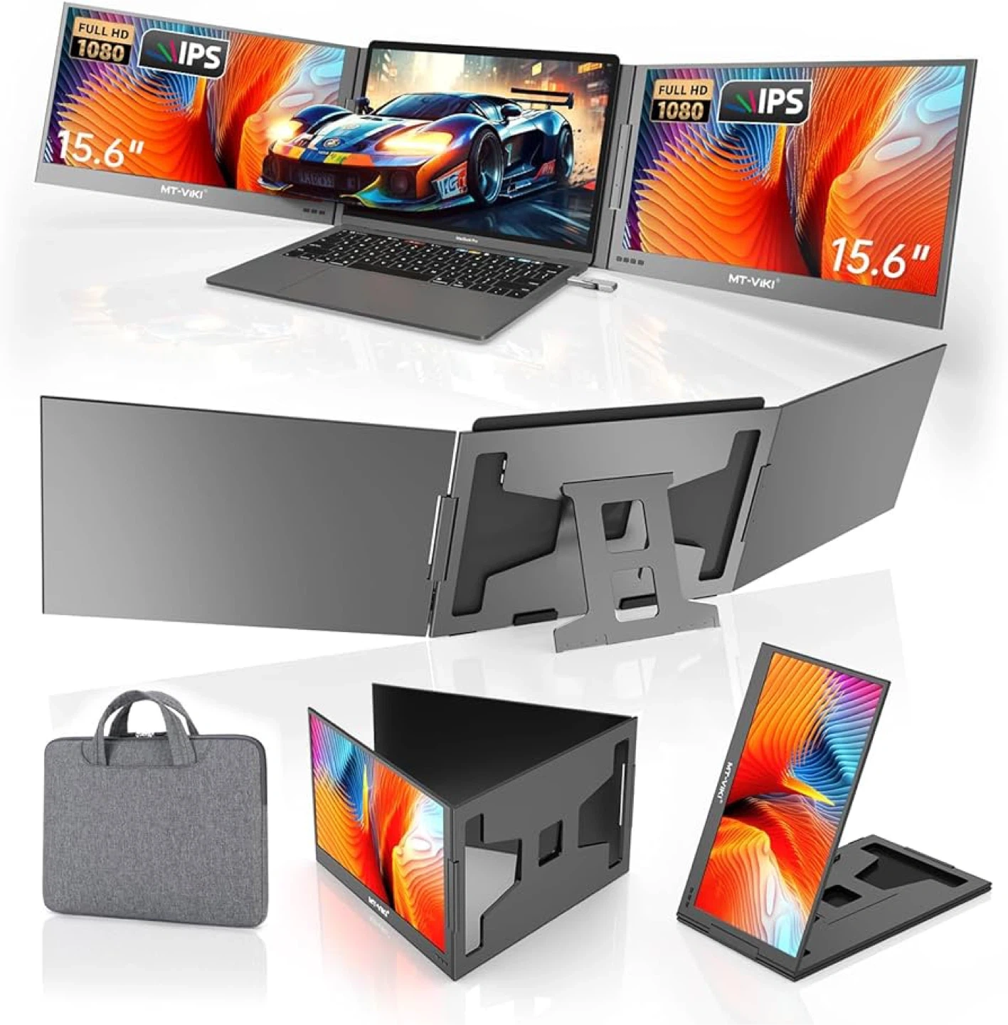 This is a MT-VIKI dual portable monitor setup for laptops. It features two 15.6" FHD 1080P IPS displays. The package includes the dual monitors, a carrying case, and all necessary cables. It's suitable for 11-16" laptops and offers 360° angle adjustment for optimal viewing.