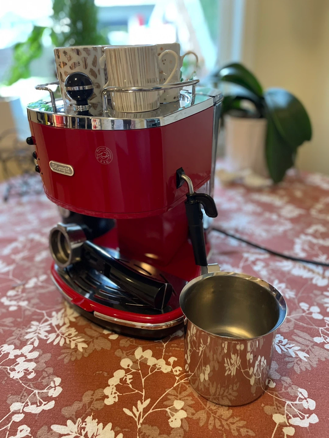 Selling a lovely red DeLonghi espresso maker! It comes with all the accessories you need to make delicious coffee at home. Also included is a Hamilton Beach coffee grinder to grind your beans fresh!