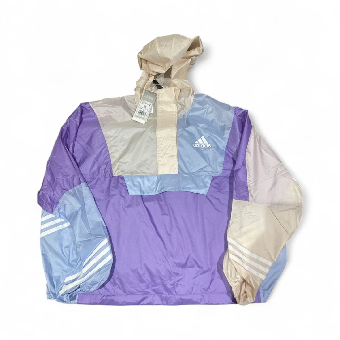 Selling an Adidas colour blocked windbreaker jacket! The jacket features a stylish combination of purple, blue, and beige tones. Perfect for adding a pop of colour to your wardrobe while staying protected from the wind