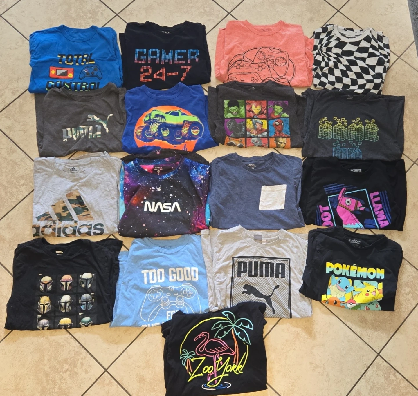 Lot of boys tshirts. Sizes are mostly 14-16. The Nasa one is quite a bit bigger than the rest. That one is mens size. Some wash wear on top right shirt. Smoke free. Dog friendly home. Pickup Fischer Hallman and Bleams area. Not separating and no delivery. $25.