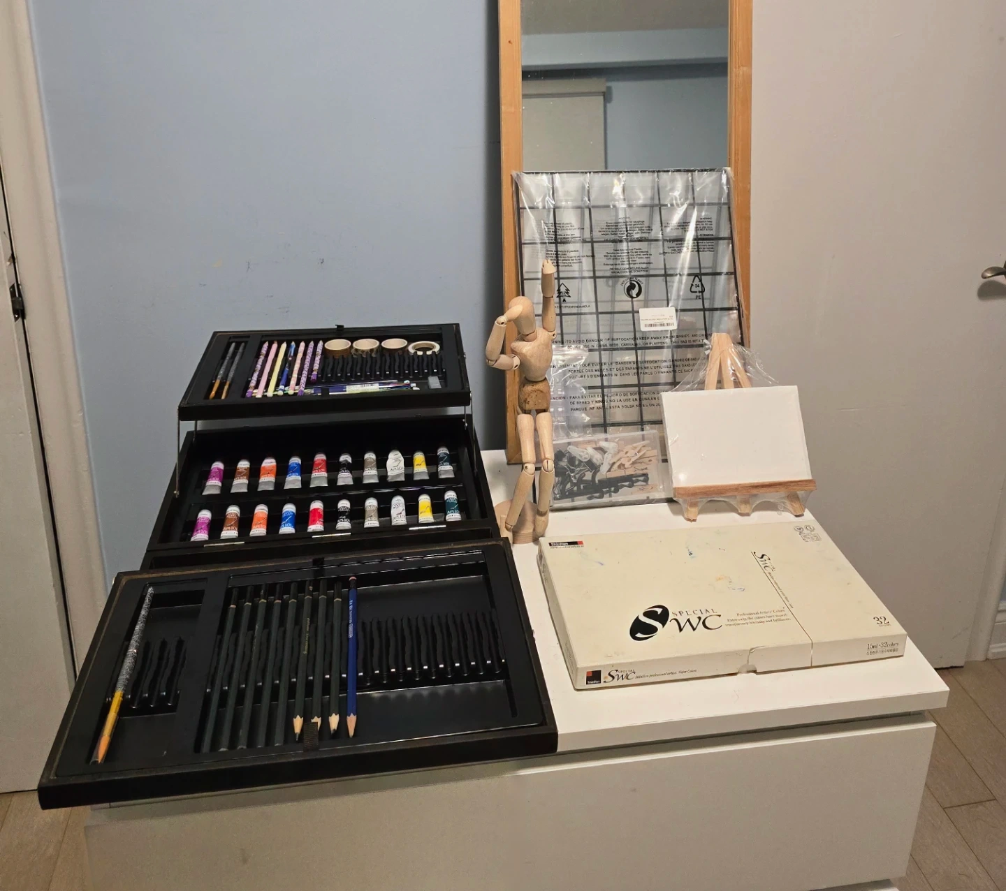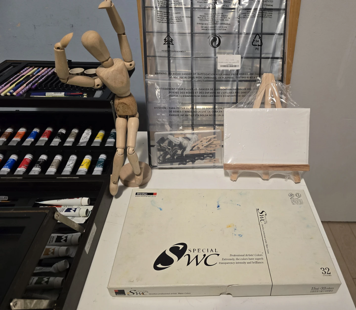 Essential Accessories: Wooden drawing mannequin, mini easel, small canvas, and a cutting mat.