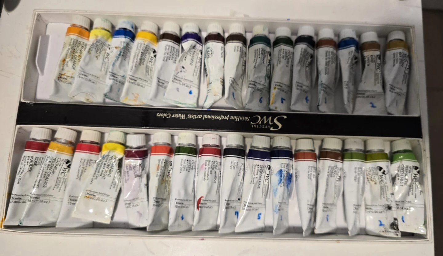 ShinHan SWC Professional Watercolors (32 colors): These are high-end, professional-grade paints. Please note that these were her favorites and are well-used. Check the photos carefully for the remaining amounts in the tubes. All are still usable and not dried out!