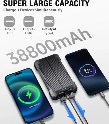 Experience the convenience of charging your devices on the go with this Solar Power Bank. Boasting an impressive 38800mAh capacity, it's ready to power up your smartphone, tablet, or other USB-compatible devices. The integrated solar charger feature allows you to harness sunlight to recharge the bank, making it a practical accessory for outdoor adventures, travel, or emergency situations. Designed with three ports, this portable solar charger can simultaneously charge multiple devices. Its sleek, compact design fits easily into any backpack, ensuring you have a reliable source of power at hand whenever you need it. Whether you're away from home or facing a power outage, this Solar Power Bank is a must-have for keeping your devices charged and running smoothly.