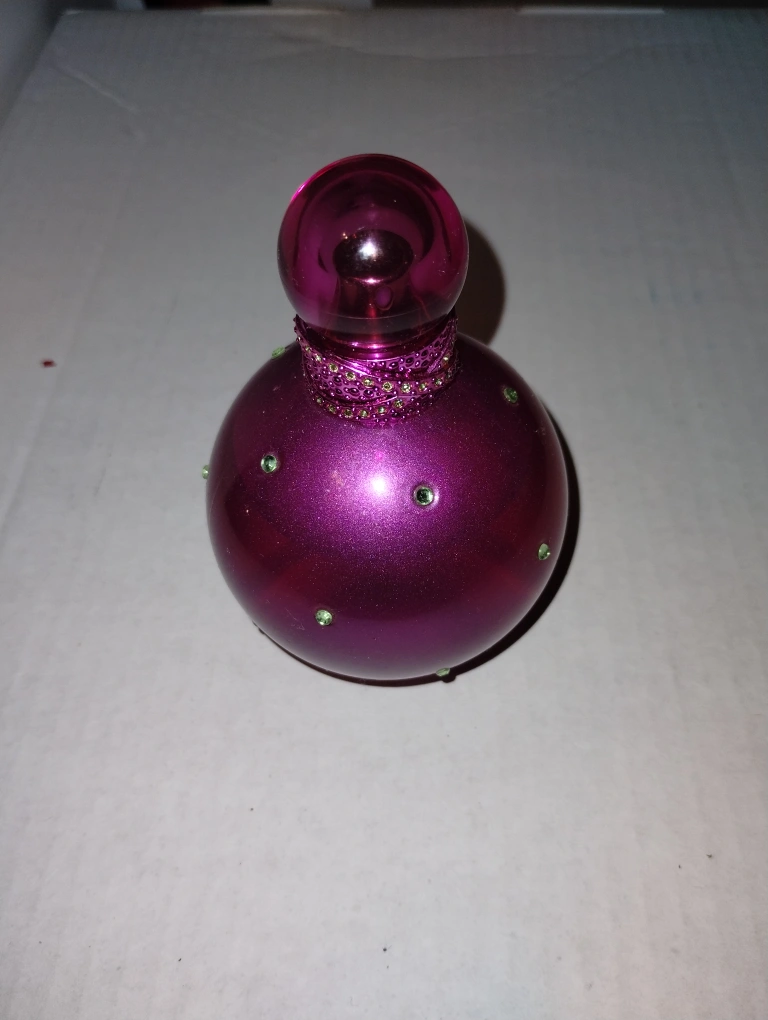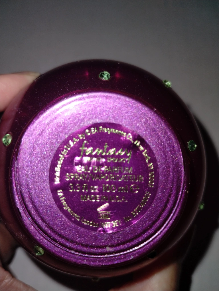 Women's perfume. Purple bottle with light green accents. Unique design. Spray perfume.
