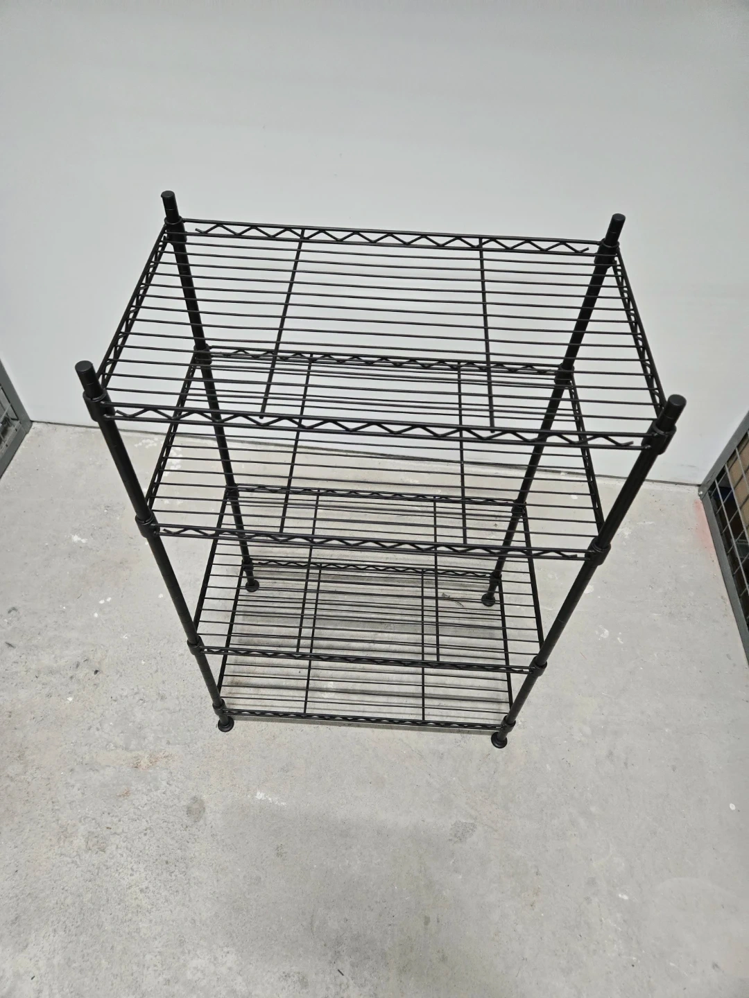 This is a black 4-tier wire shelving unit. It's made of durable metal and features adjustable shelves. The open design allows for easy access and good ventilation. It's handy for storage in a garage, kitchen, or workshop!