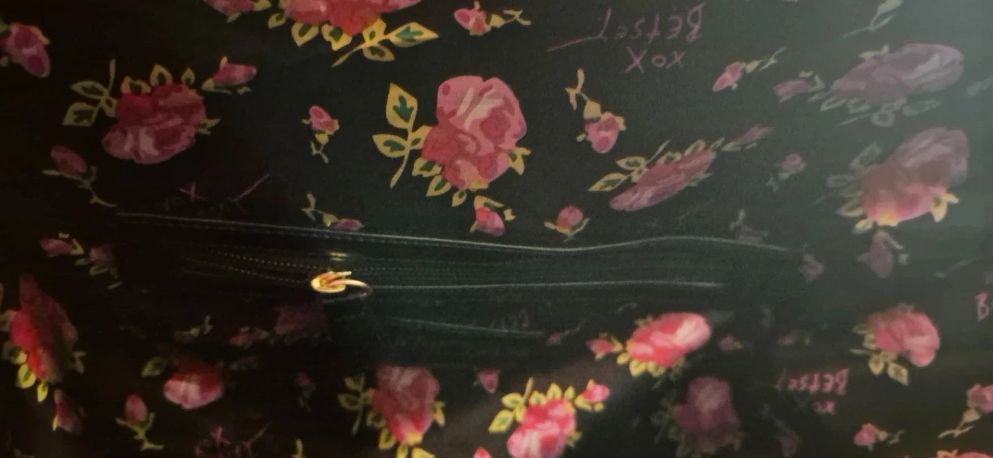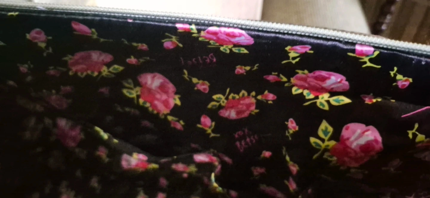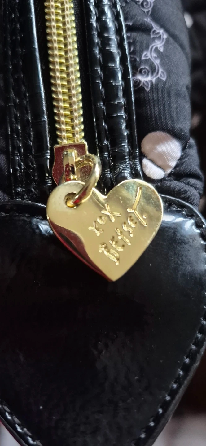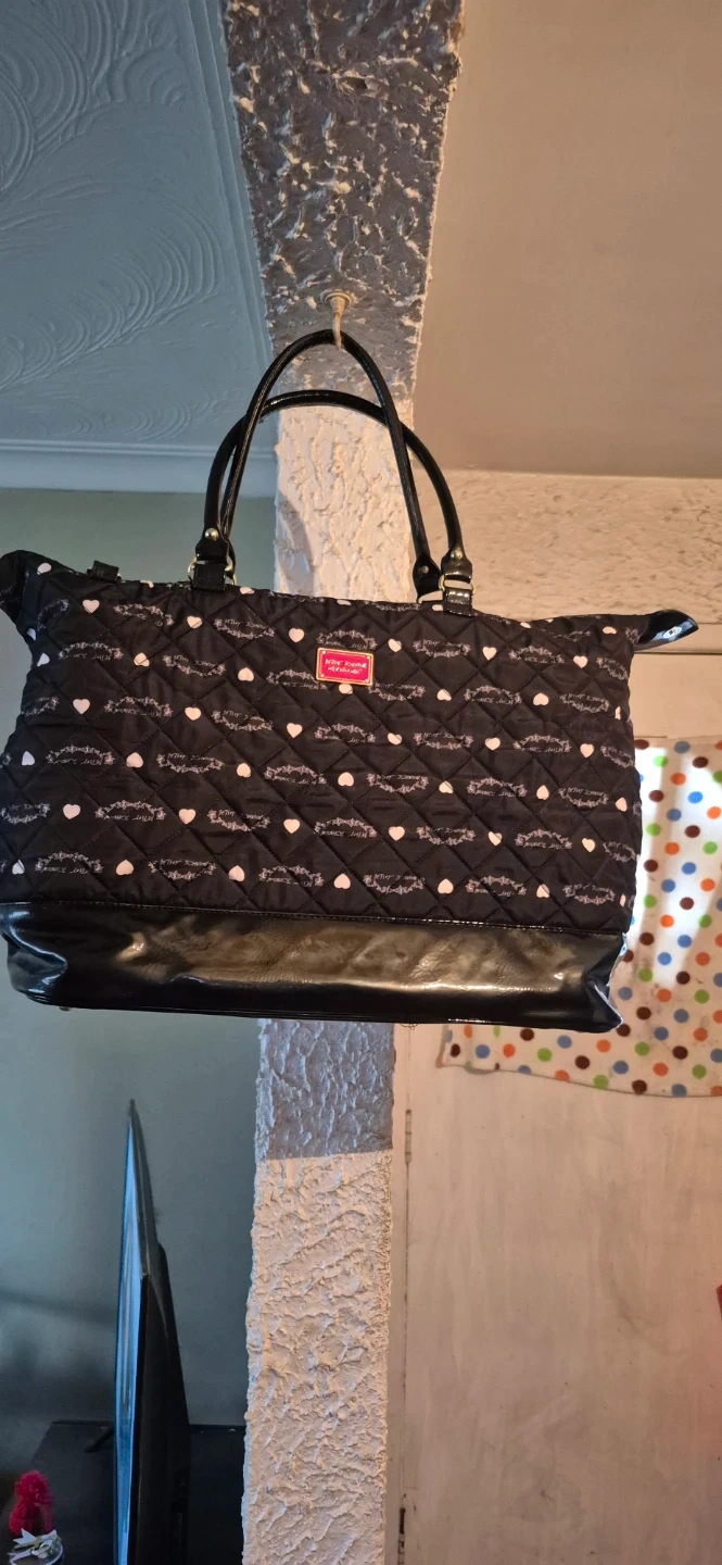 This is a black quilted tote bag by Betsey Johnson. New York /NY. It features a patterned exterior and a floral print interior. Comes with a shoulder strap and gold-tone hardware, including a heart-shaped zipper pull. Can be worn as a shoulder bag or carried as a tote. In Mint Condition, clean, no tares, rips. Lovingly taken care of. Ready to add some flair to your outfit.