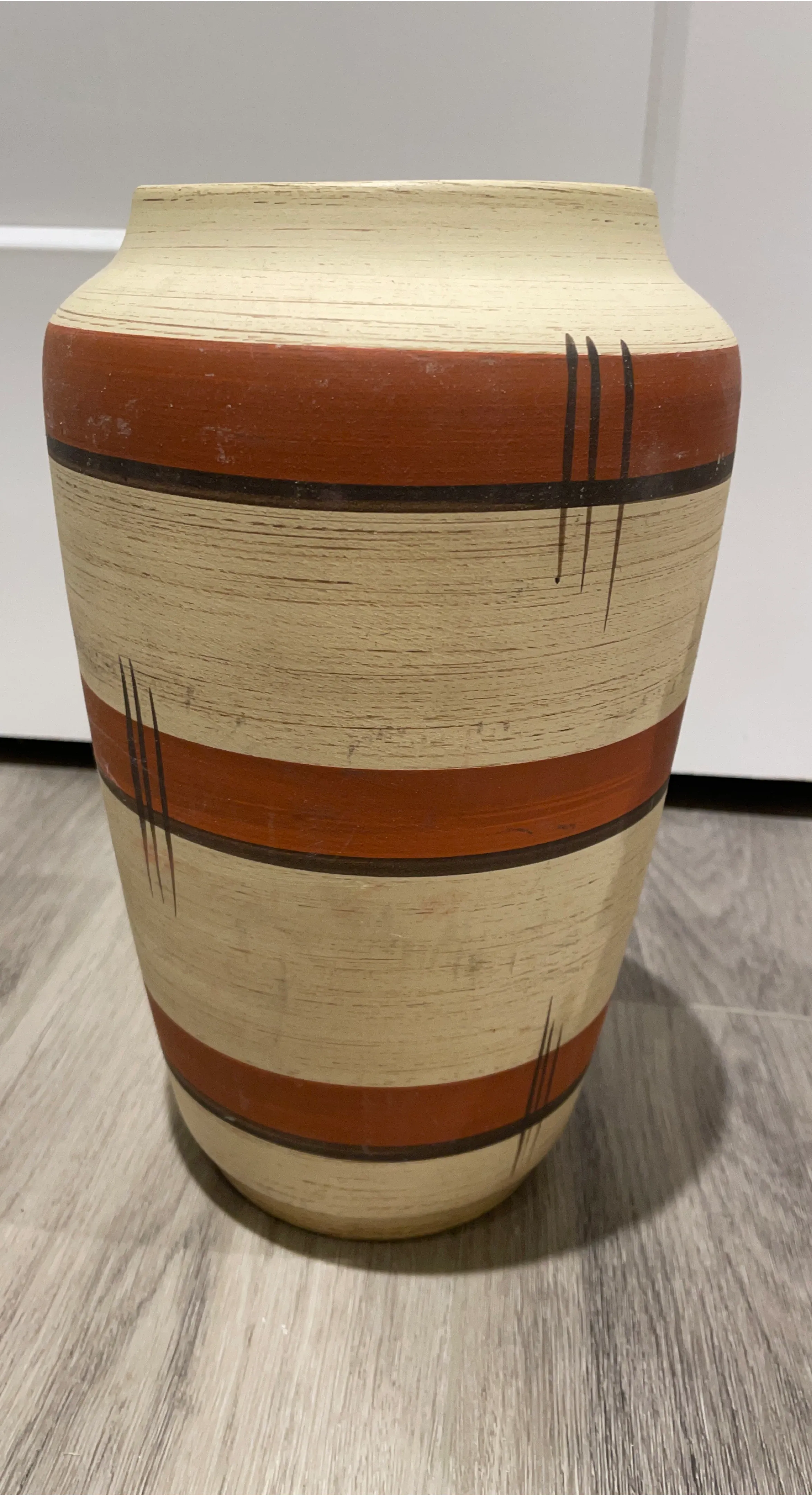 A decorative ceramic vase with a striped pattern. Cream and burnt orange colours. Great for holding flowers or as a standalone decorative piece.